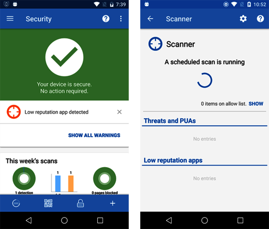 | Erkennung aktueller Android-Malware aus den letzten 4 Wochen 2.842 verwendete Samples | 98,5% | 100% |