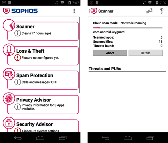 | Erkennung einer repräsentativen Menge an Android Malware aus den letzten 4 Wochen (AV-TEST Referenz-Testset) 2.928 verwendete Samples | 97,6% | 100% |