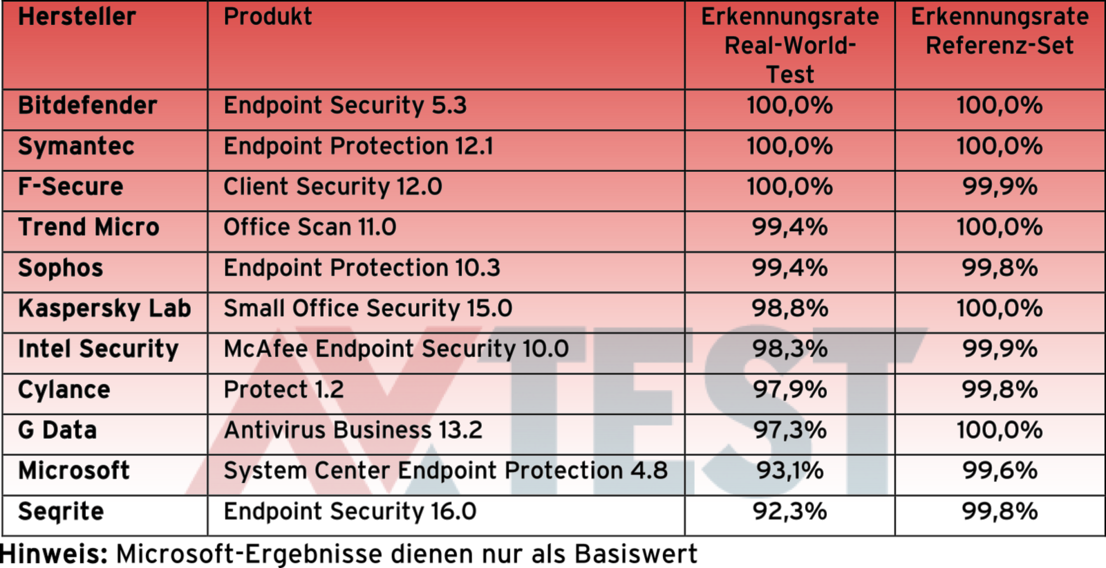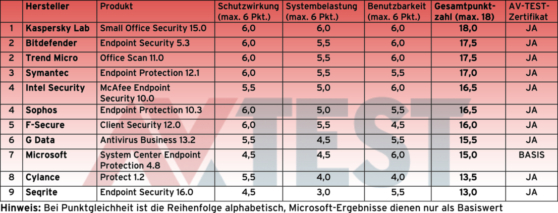 Das Ergebnis des mitgetesteten Security-Moduls von Microsoft, das System Center Endpoint Protection, dient dem Labor als Basiswert zum Vergleich. Die Messlatte lag somit bei 15 Punkten, welche aber von Intel Security, Sophos, F-Secure und G Data überschritten wurde. Lediglich die Produkte von Cylance und Seqrite lagen mit 13,5 und 13 Punkten darunter.