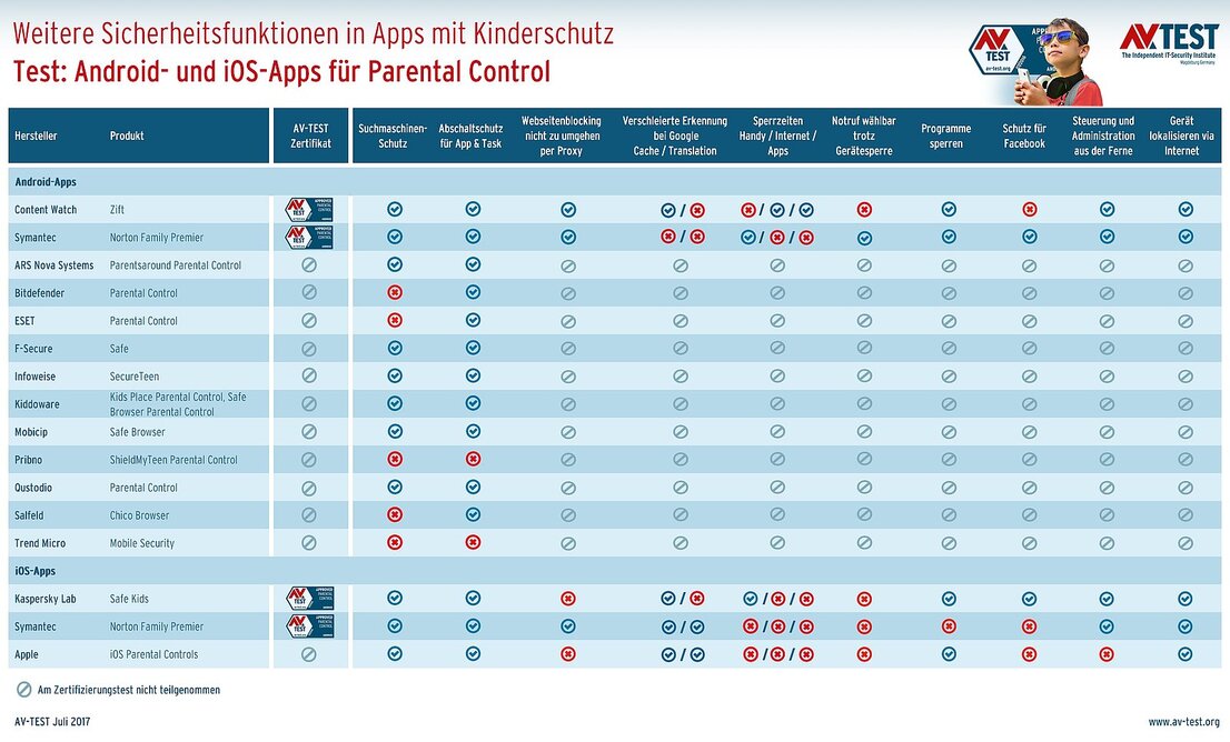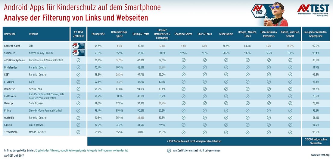 Geprüft wurden 13 Apps für Android, 2 Apps für iOS und die interne Kinderschutz-App von iOS. Die Android-Beschützer Norton Family Premier von Symantec und Zift von Content Watch stellten sich einem ausführlichen Zertifikatstest. Sie mussten daher viel mehr Prüfungen und Filterungen bestehen als die anderen Apps.