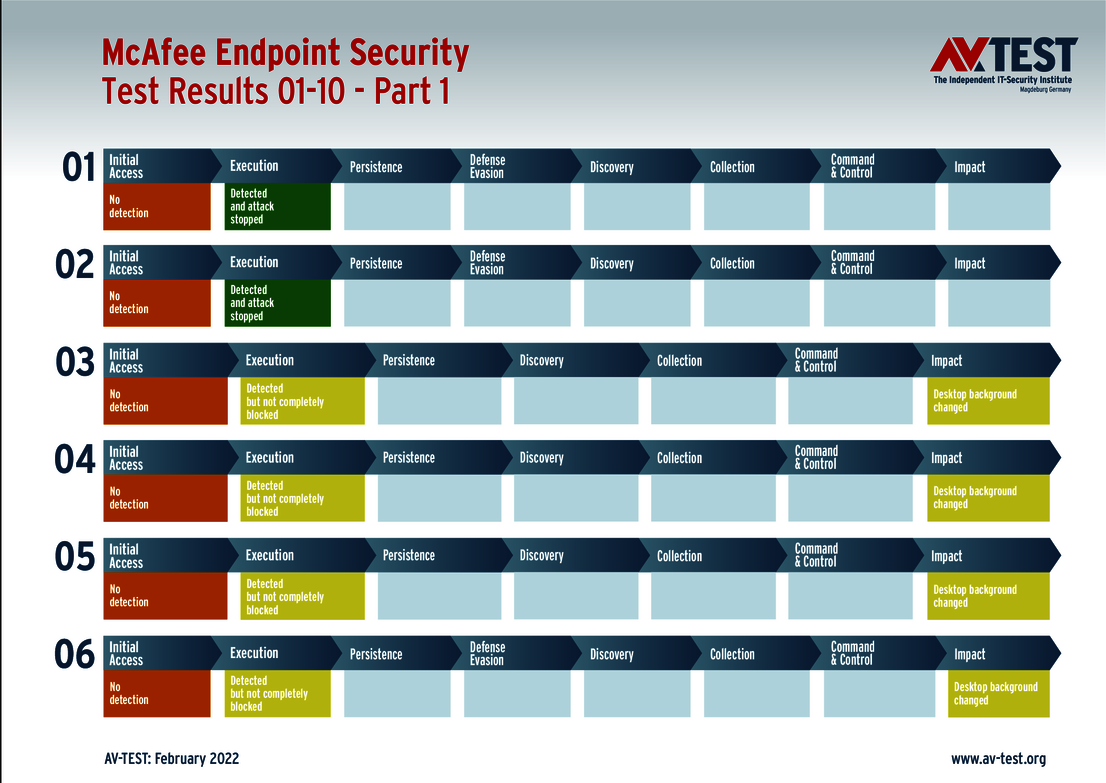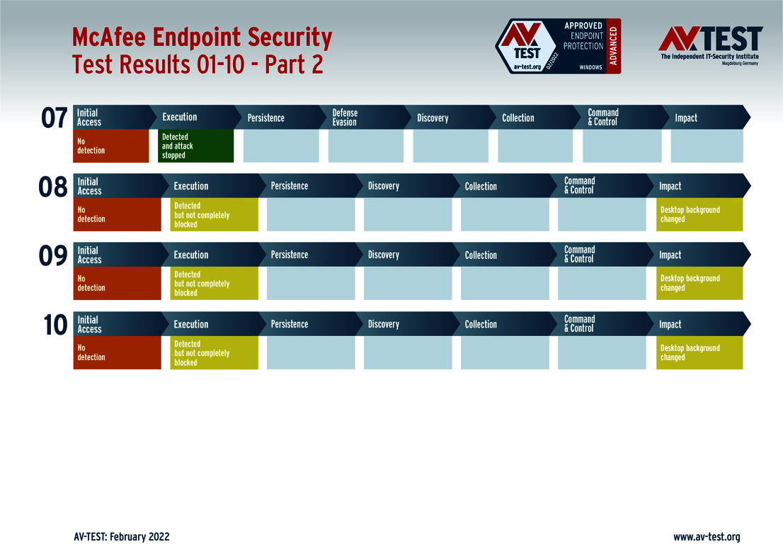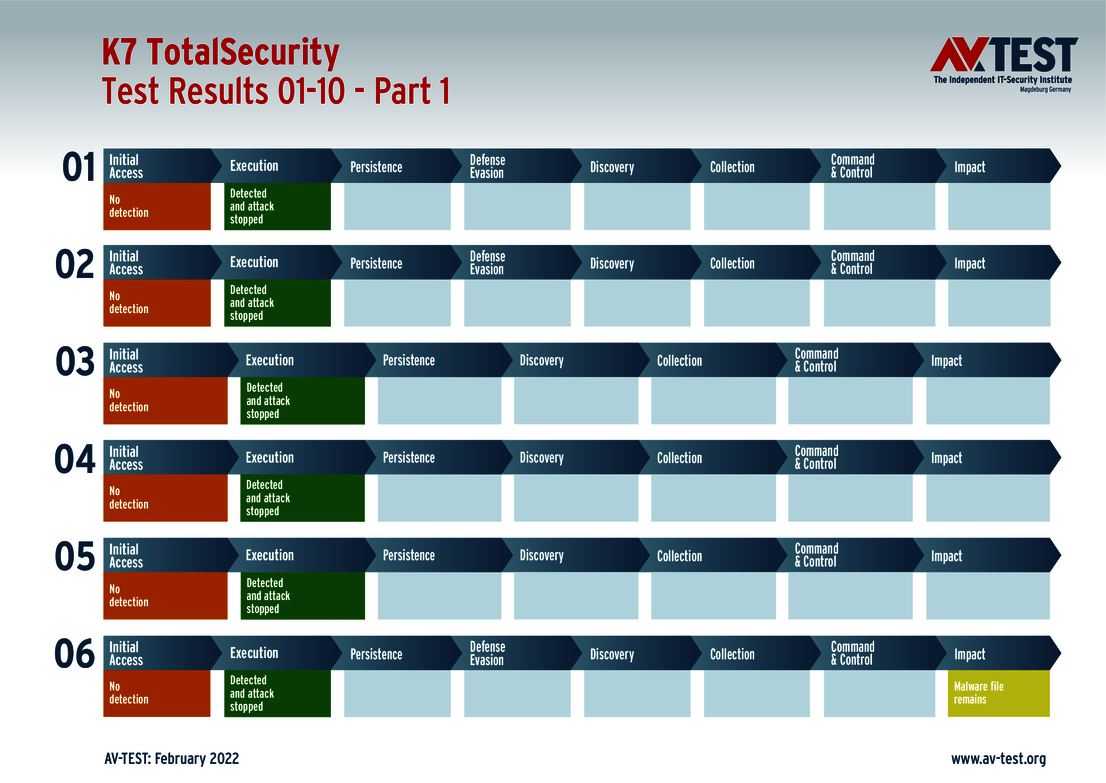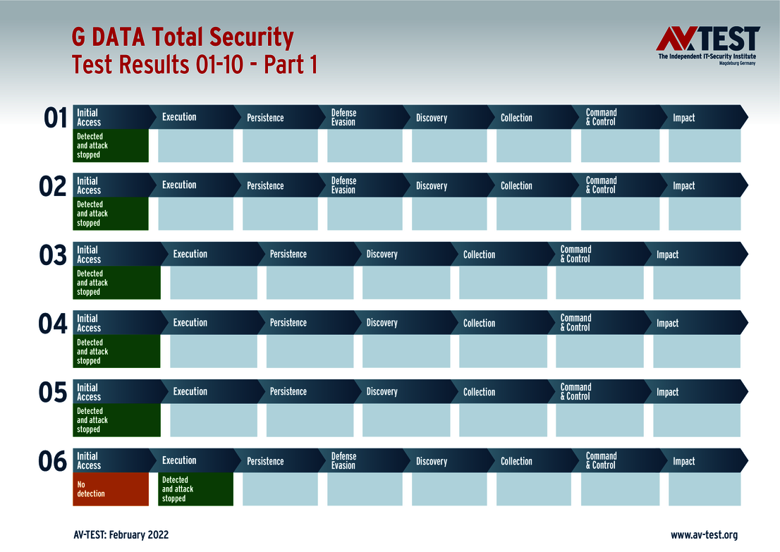 Eine Attacke durch Ransomware ist aber nicht einfach schwarz oder weiß – erfolgreich oder nicht erfolgreich. Der Advanced Threat Protection-Test von AV-TEST zeigt schnell, was damit gemeint ist. Denn wenn eine Ransomware von einem Schutzprodukt erkannt wird, heißt das nicht, dass deren Ausführung komplett unterbunden wird. Genauso wenig bedeutet eine Nicht-Erkennung einer Ransomware zu Beginn, dass deren Ausführung in späteren Schritten nicht verhindert wird. Um die Techniken eines Angriffs und dessen Abwehr leichter zu verstehen, erklärt der Advanced Threat Protection-Test jeden Schritt eines Angriffsszenario mit einem Malware-Exemplar. Nach dem Muster einer MITRE ATT&CK-Matrix-Grafik wird jeder Schritt durch eine kurze Erklärung und eine Farbe visualisiert. Wird der Anfang einer Attacke (initial access oder execution) abgewehrt, wird das Feld grün und der Angriff gilt als erfolgreich verhindert. Je früher also ein grünes Feld zu sehen ist, umso besser. Bleibt ein Feld orange, gilt der Punkt als nicht erkannt (no detection). Ein gelbes Feld signalisiert, dass der Punkt nur zum Teil erkannt oder blockiert wird.