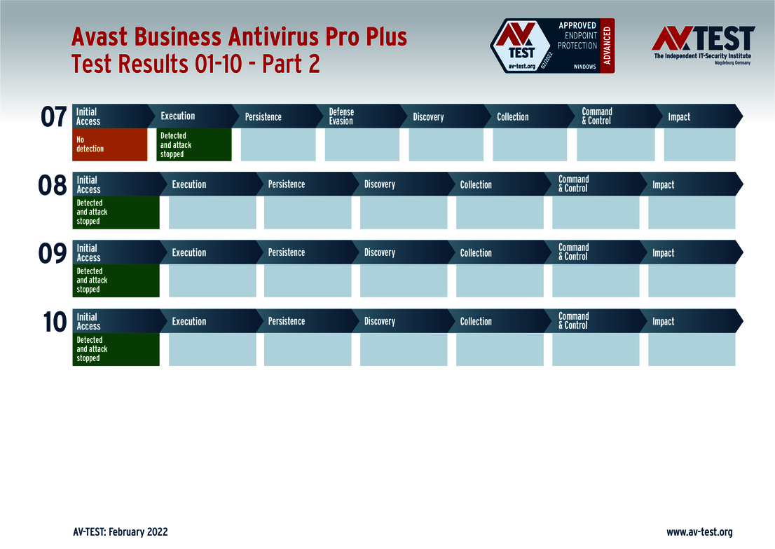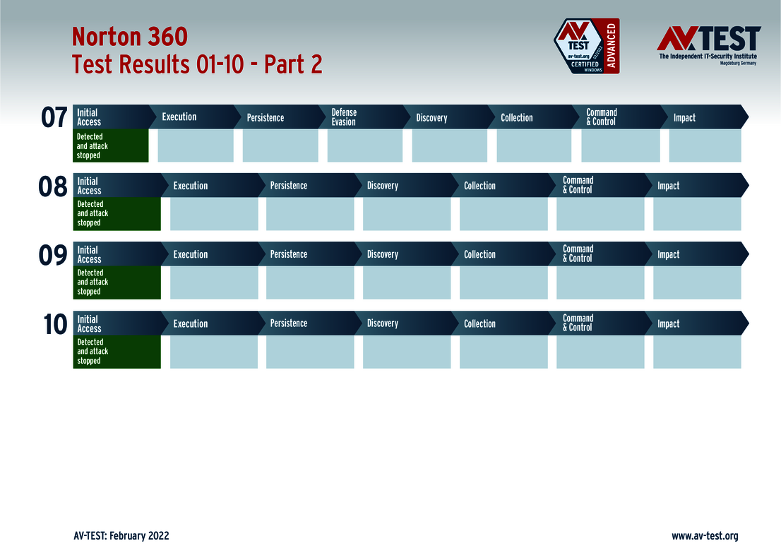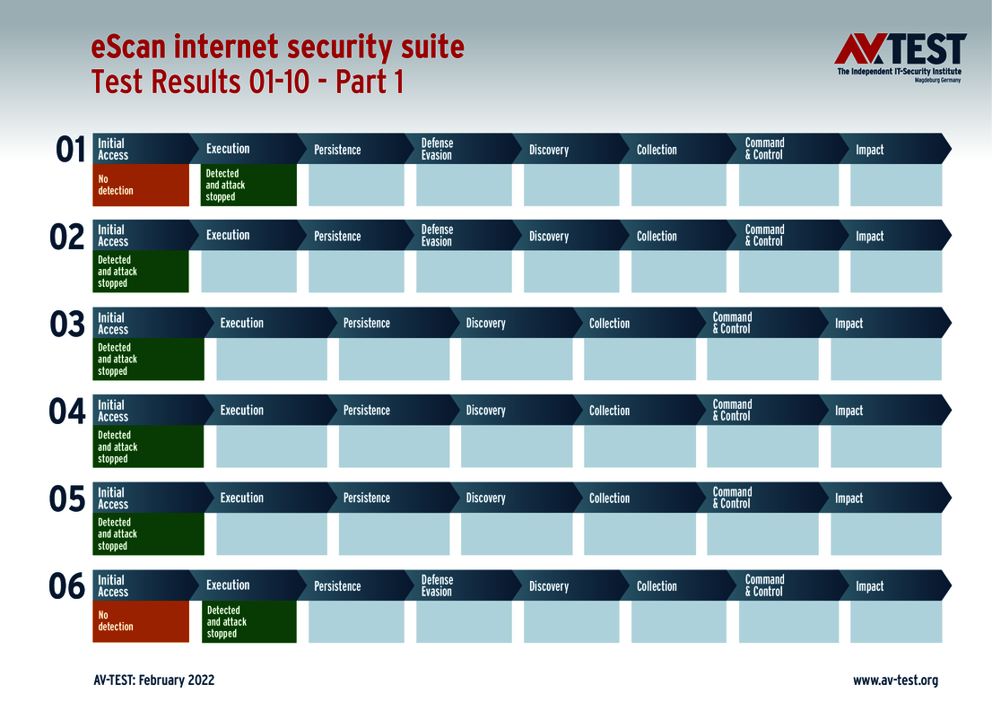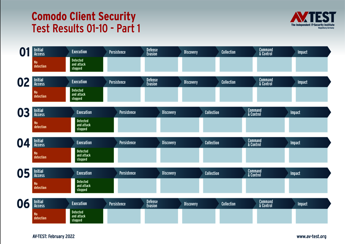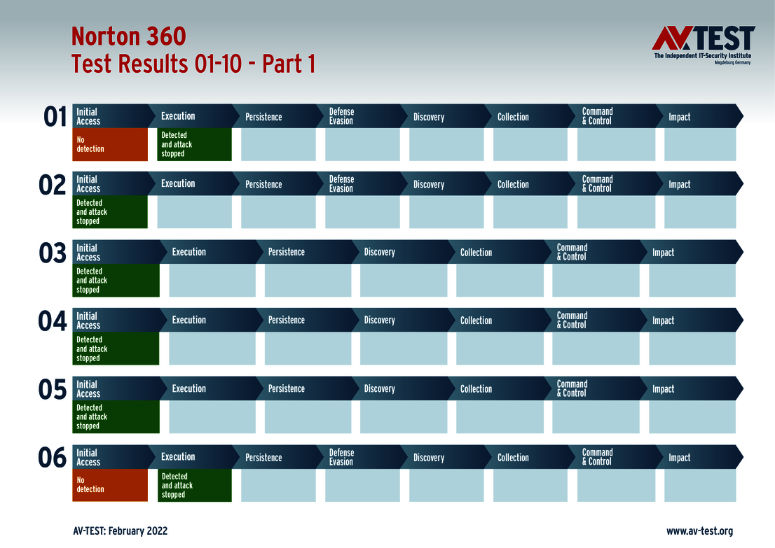 Eine Attacke durch Ransomware ist aber nicht einfach schwarz oder weiß – erfolgreich oder nicht erfolgreich. Der Advanced Threat Protection-Test von AV-TEST zeigt schnell, was damit gemeint ist. Denn wenn eine Ransomware von einem Schutzprodukt erkannt wird, heißt das nicht, dass deren Ausführung komplett unterbunden wird. Genauso wenig bedeutet eine Nicht-Erkennung einer Ransomware zu Beginn, dass deren Ausführung in späteren Schritten nicht verhindert wird. Um die Techniken eines Angriffs und dessen Abwehr leichter zu verstehen, erklärt der Advanced Threat Protection-Test jeden Schritt eines Angriffsszenario mit einem Malware-Exemplar. Nach dem Muster einer MITRE ATT&CK-Matrix-Grafik wird jeder Schritt durch eine kurze Erklärung und eine Farbe visualisiert. Wird der Anfang einer Attacke (initial access oder execution) abgewehrt, wird das Feld grün und der Angriff gilt als erfolgreich verhindert. Je früher also ein grünes Feld zu sehen ist, umso besser. Bleibt ein Feld orange, gilt der Punkt als nicht erkannt (no detection). Ein gelbes Feld signalisiert, dass der Punkt nur zum Teil erkannt oder blockiert wird.