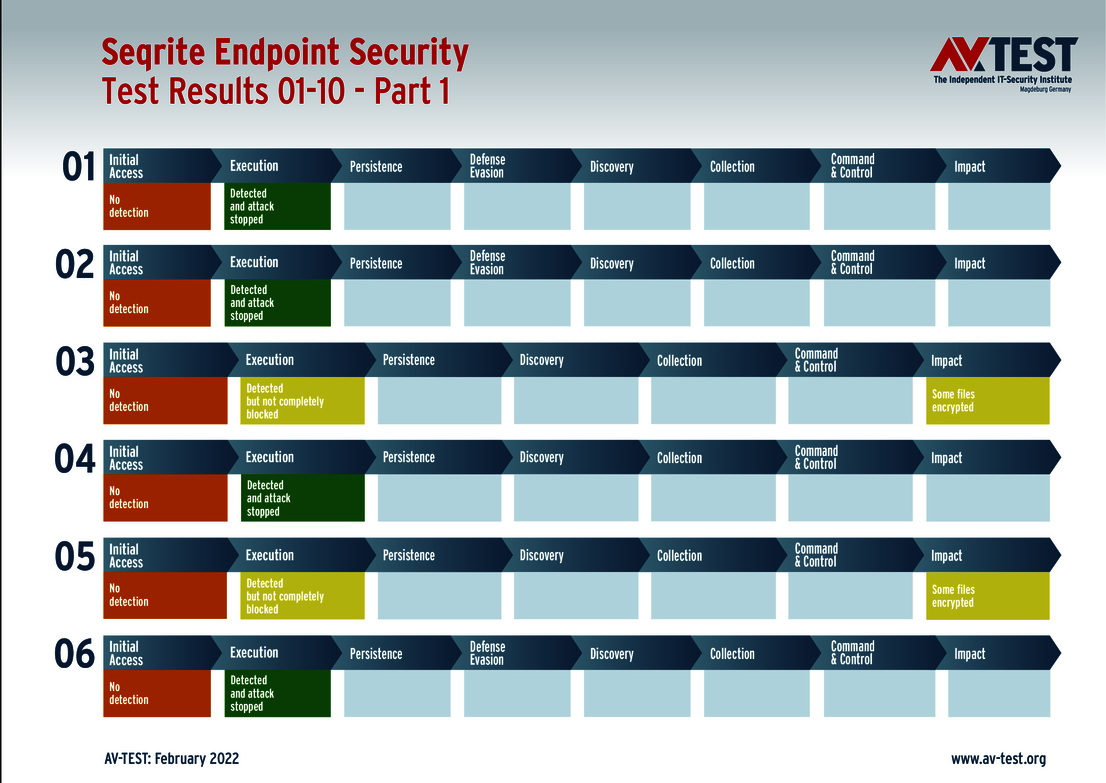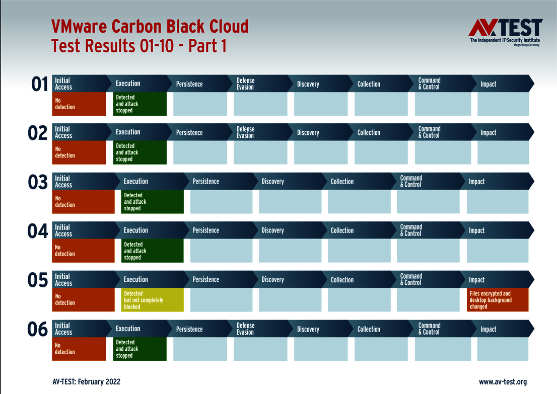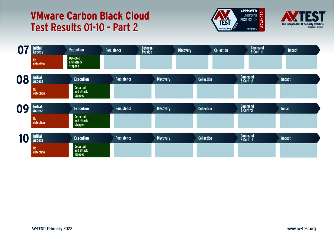Im Test erkennen alle Produkte ausnahmslos die Angreifer bereits in den ersten Schritten (initial access oder execution). Allerdings ist damit nur bei 10 von 14 Produkten die Attacke erkannt und auch vollständig geblockt. Bei den 4 Produkten von Symantec, Seqrite, VMware und Trellix geht der Angriff weiter.