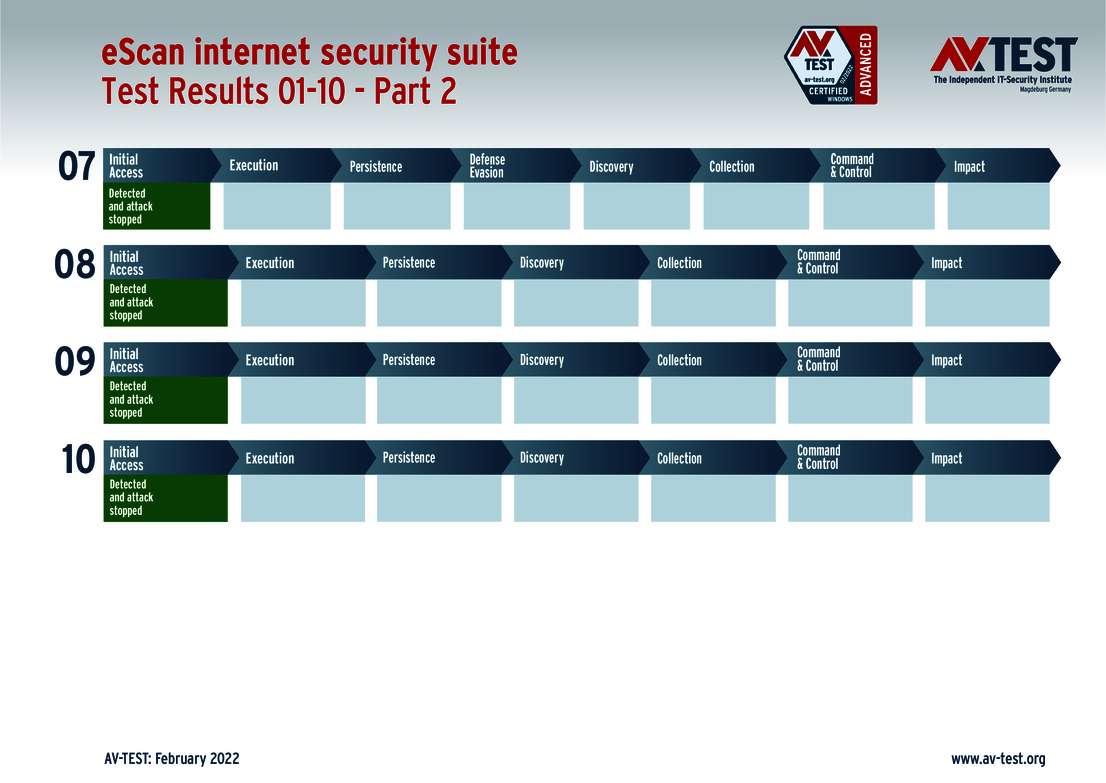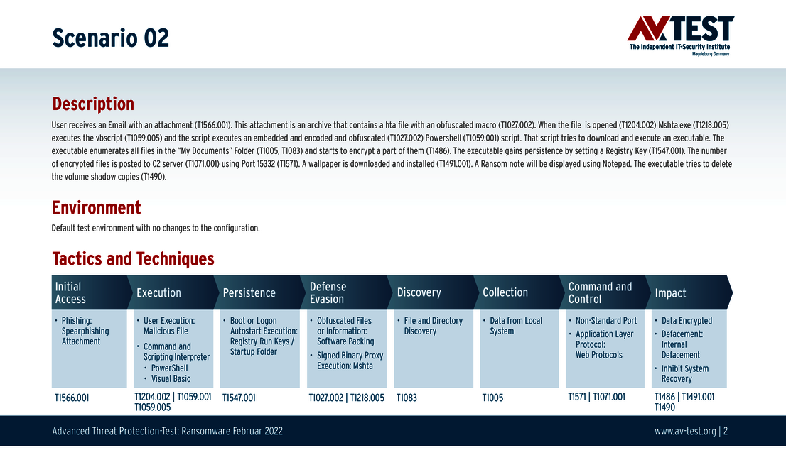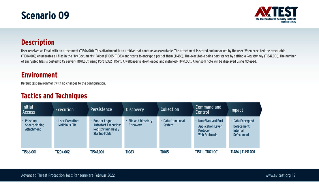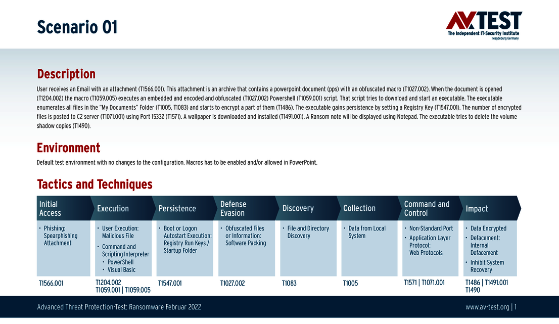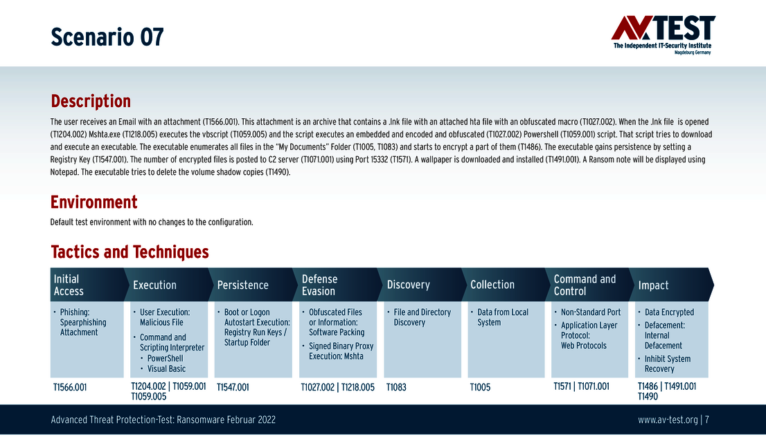 Alle Produkte müssen in 10 realen Szenarien unter Windows 10 gegen Ransomware bestehen. Dabei kommen zum Beispiel Dateien mit versteckter Malware in Archiven, Powerpoint-Dateien mit Scripten oder HTML-Dateien mit gefährlichen Inhalten zum Einsatz. Die 10 Grafiken zu den „Testszenarien“ listen die Art des Angriffs und jeden Schritt dazu auf. Dabei gibt das Labor sogar die Definitionen in MITRE ATT&CK Technikcodes an. Die genauen technischen Schritte eines Advanced Threat Protection-Tests erklärt das Labor für Interessierte auch in dem bereits erschienen Artikel Neue Abwehrkräfte: EPPs und EDRs im Test gegen APT- und Ransomware-Attacken.
