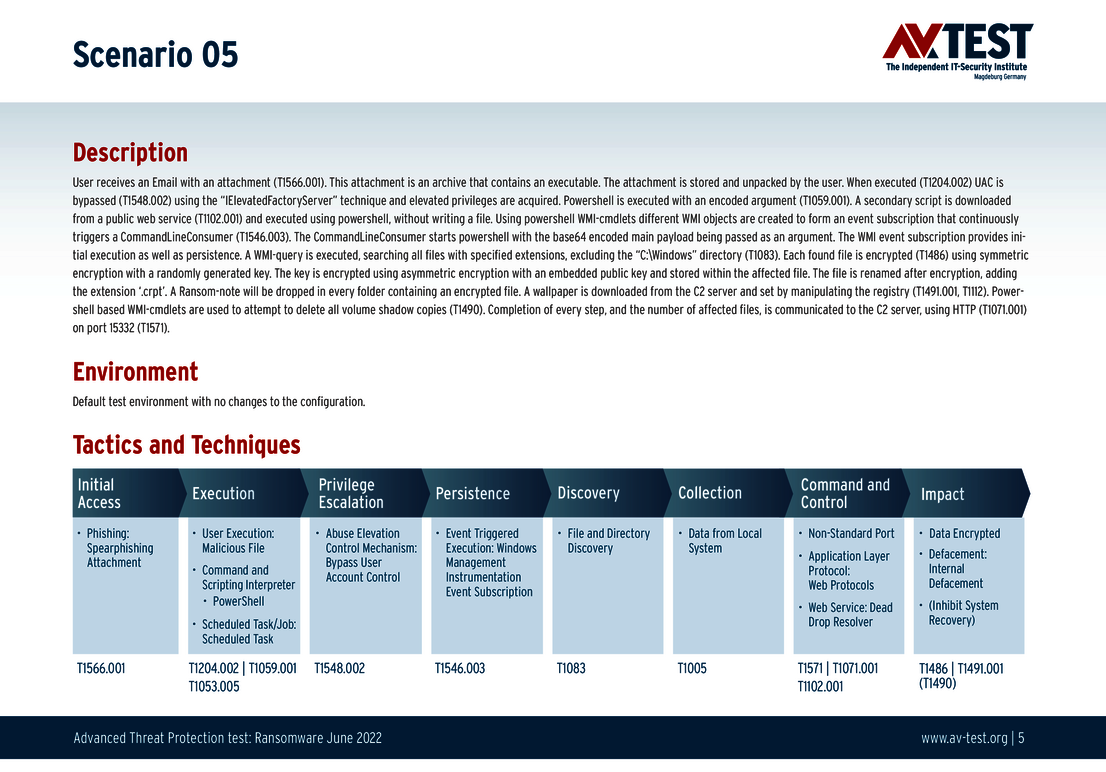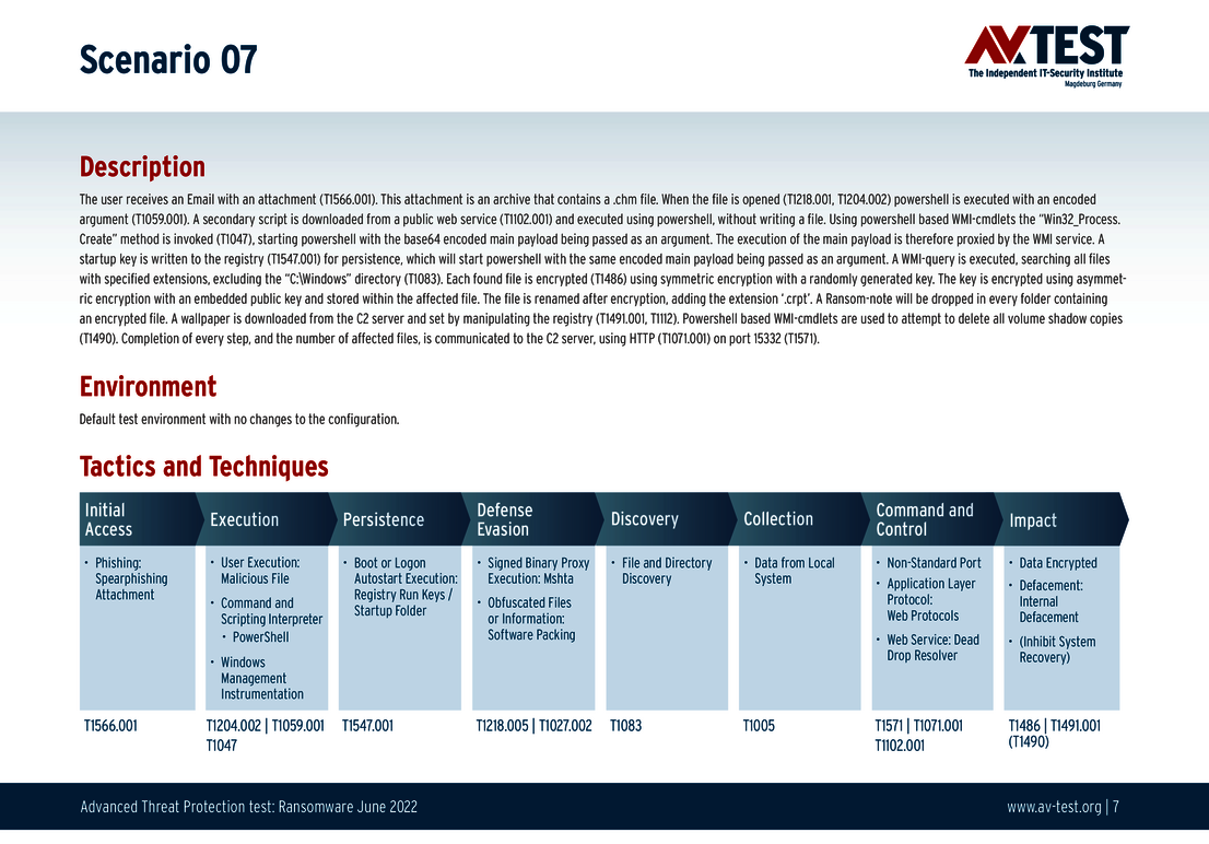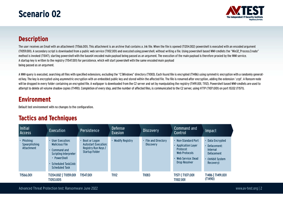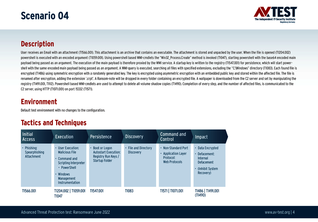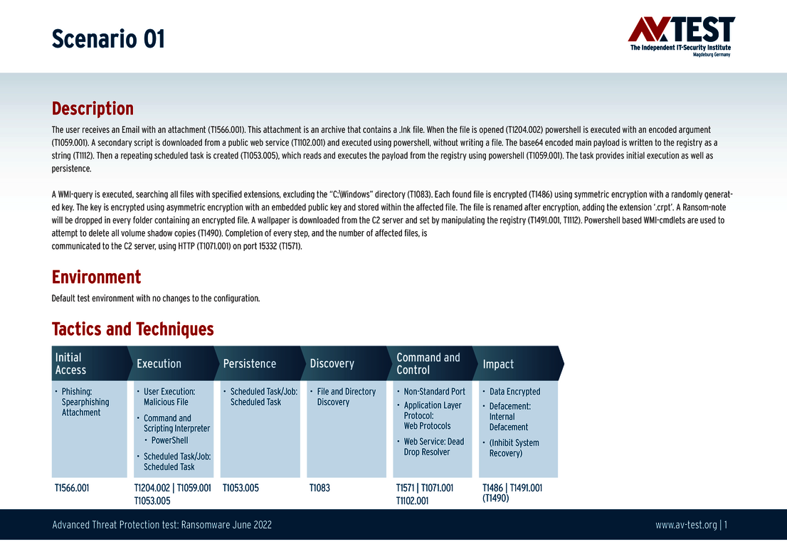 Jedes der 10 Test-Szenarien ist definiert und in den untenstehenden Grafiken technisch genau beschrieben. So geht zum Beispiel einem Angriff eine Spear-Phishing-Attacke voraus und eine Mail mit einem Anhang wird entpackt. Eine darin versteckte Datei wird ausgeführt und beginnt mit dem praktischen Angriff auf das System und der Verschlüsselung. Alle in der Grafik angegebenen Schritt des Szenarios gibt das Labor in „Techniques“ Codes von MITRE ATT&CK an. Somit ist das Szenario selbst für Fachleute ganz genau nachvollziehbar. Die technischen Schritte eines Advanced Threat Protection-Tests erklärt das Labor für Interessierte auch im bereits erschienenen Artikel Neue Abwehrkräfte: EPPs und EDRs im Test gegen APT- und Ransomware-Attacken.
