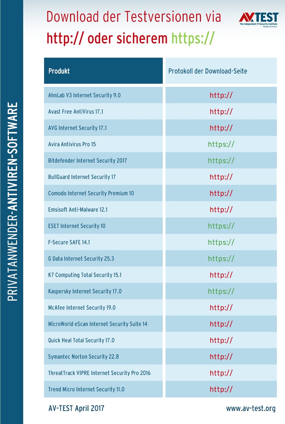Während es bei den Firmenlösungen kaum Direkt-Downloads gibt, bietet fast jeder Hersteller seine Testversionen für Privatkunden an. Das Ergebnis dieser kurzen Kontrolle der Downloads ist ernüchternd: von 19 Herstellern bieten 13 die Testversionen per unsicherem HTTP an. Lediglich Avira, Bitdefender, ESET, F-Secure, G Data und Kaspersky Lab nutzen das sichere HTTPS-Protokoll.