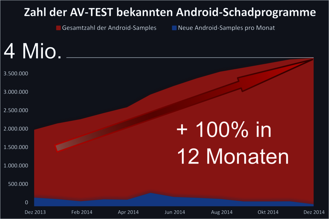AV-TEST zählt bereits 4 Millionen verseuchte Apps für Android – das sind doppelt so viele wie noch ein Jahr zuvor (Stand AV-TEST, Dezember 2014).