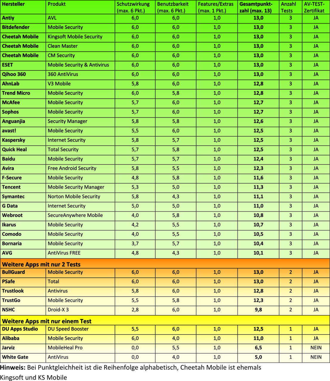 Gleich 7 der 26 Apps, die an allen Testrunden teilgenommen haben, erreichten die Bestmarke von 13 Punkten. Sie kommen von Antiy, Bitdefender, Cheetah Mobile (drei Versionen), ESET und Qihoo. Weitere 10 Apps folgen mit ebenfalls sehr guten Punktzahlen zwischen 12,3 und 12,8 Punkten.