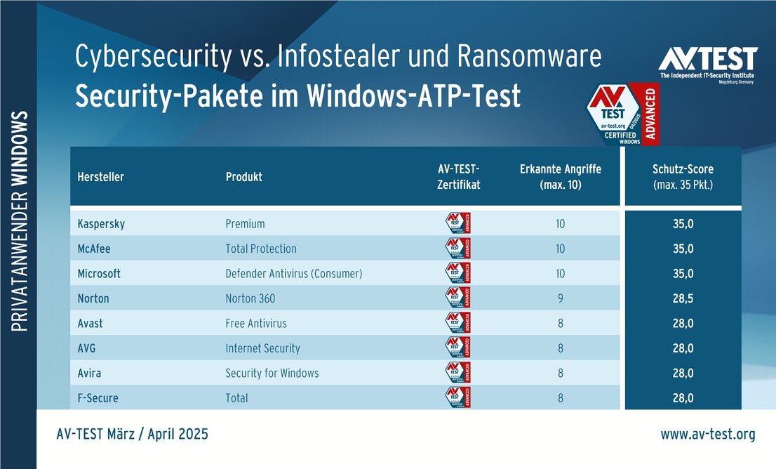 Im März-April-ATP-Test gibt es bei den Produkten für private Anwender einige negative Überraschungen. Von den 8 untersuchten Paketen liefern nur 3 Produkte eine lückenlose Abwehr in allen 10 Szenarien und erhalten so die maximalen 35 Punkte: Kaspersky, McAfee und Microsoft.