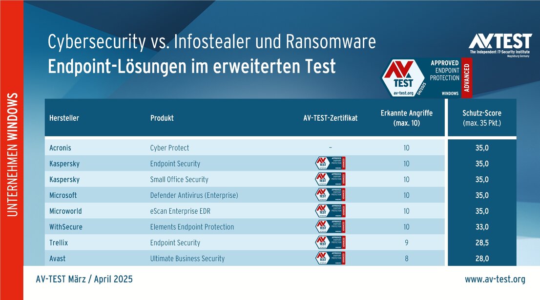 Dem Test stellen sich 8 Pakete für private Anwender und 8 Endpoint-Lösungen für Unternehmen. Alle Produkte wurden im März und April 2025 unter Windows 10 Professional untersucht.