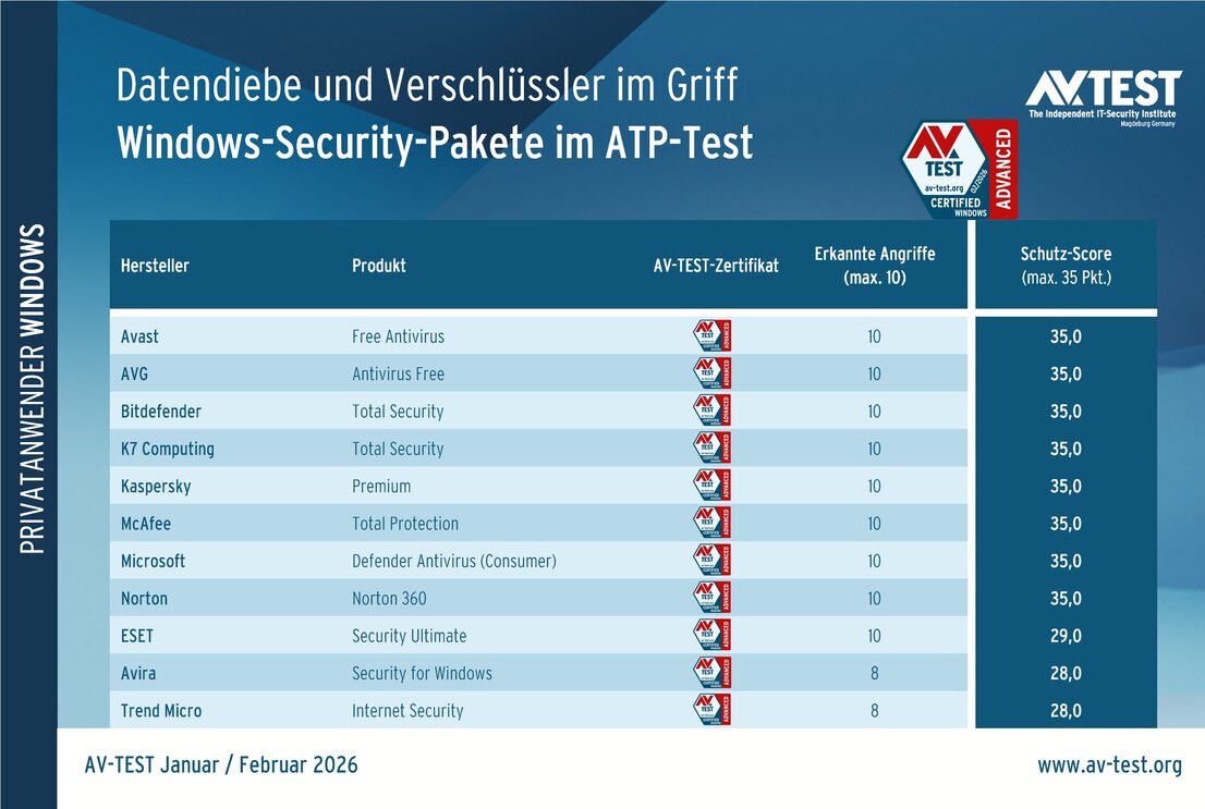 Für eine erfolgreiche Teilnahme am Zertifizierungstest muss ein Produkt 75 Prozent der 35 Punkte (26,5 Punkte) im Schutz-Score erreichen. Das schaffen alle 11 Pakete. Weiterhin müssen die Produkte an den regelmäßigen 2-monatigen Windows-Tests teilnehmen. Auch diese Vorgabe erfüllen alle Produkte und erhalten somit das AV-TEST-Zertifikat „Advanced Certified“.