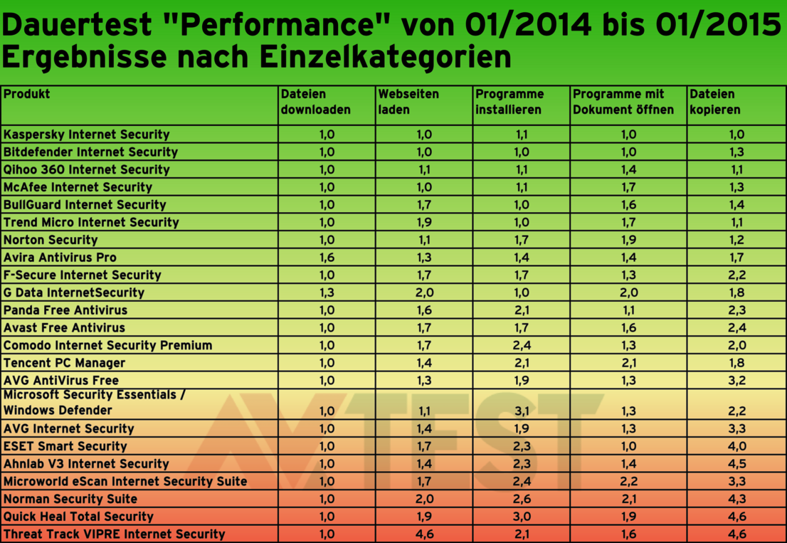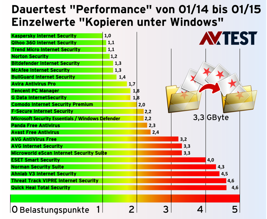 Der Test belegt, dass lediglich die Lösung von Qihoo 360 und Kaspersky den Kopiervorgang nur sehr gering verzögern. 8 Produkte müssen bereits zwischen 1 und 2 Punkte für ihre Belastung hinnehmen. 5 Schutzpakete liegen im Test zwischen 2 und 3 Punkten, 3 Pakete zwischen 3 und 4 Punkten und 5 Pakete sogar im Schnitt bei über 4 Punkten.