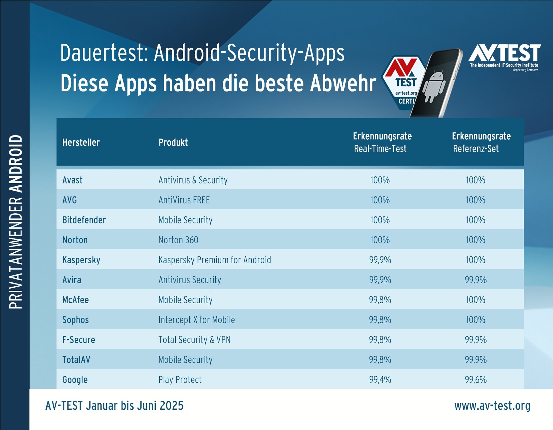 An der Untersuchung nehmen die 11 Android-Security-Apps dieser Hersteller teil: Avast, AVG, Avira, Bitdefender, F-Secure, Kaspersky, McAfee, Norton, Sophos, TotalAV. Mit im Test ist auch der Google-Schutz Play-Protect, der auf Android-Systemen mit Play Store installiert ist.