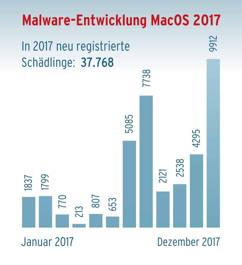 Auch wenn es viele Mac-Nutzer nicht wahrhaben wollen: sie stehen immer öfter auf der Angriffsliste von Malware-Schreibern. Kaspersky Lab zählte 2016 bereits 12 Millionen Attacken nur auf seine Mac-Nutzer. Die von AV-TEST erfassten Schädlinge für MacOS wuchsen alleine in 2017 um fast 38.000 Exemplare an. Ransomware ist es nur recht, wenn sie neben Windows-Nutzern auch Mac-User abkassieren kann.