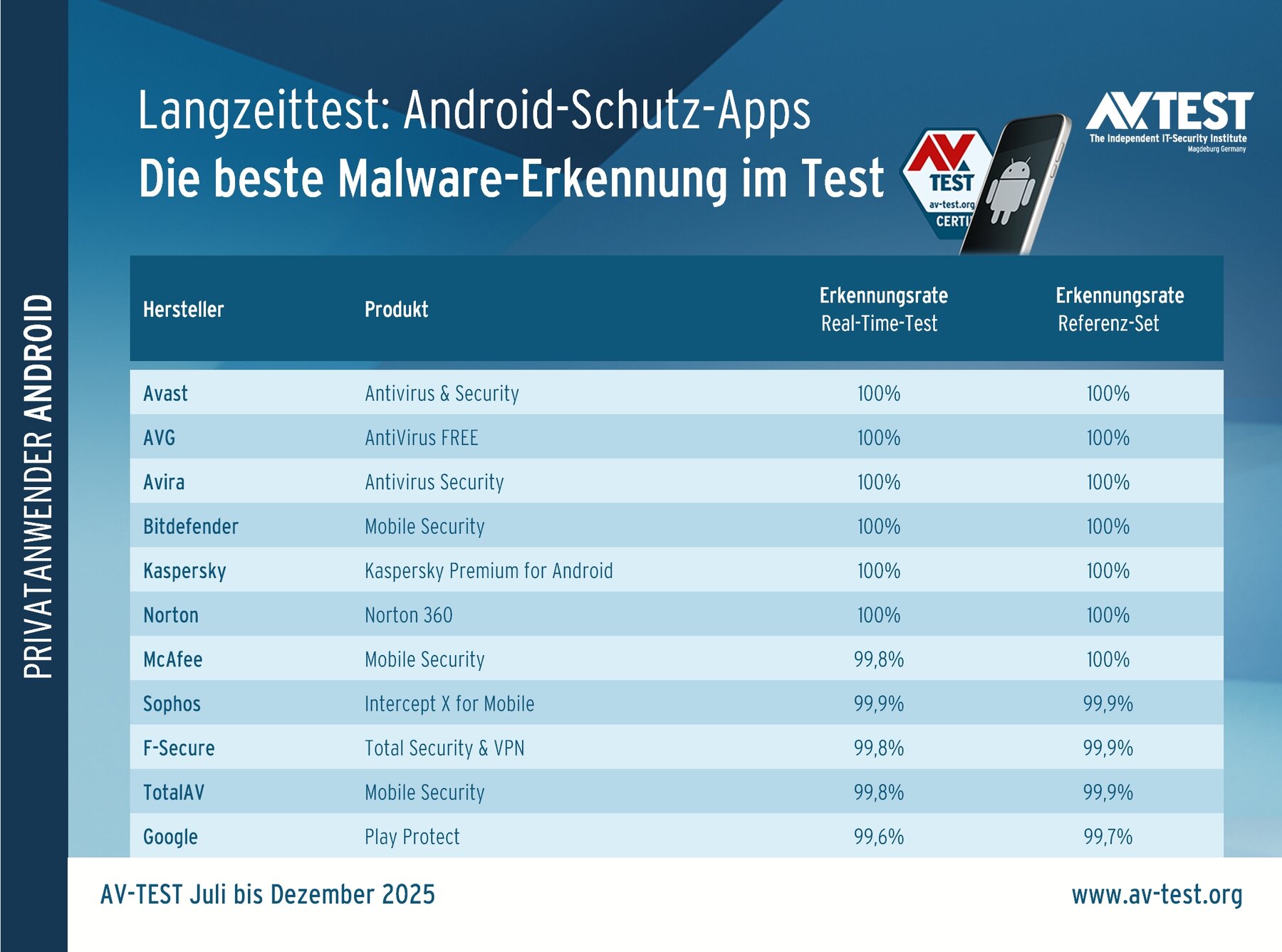 Auf allen Android-Geräten mit einer lizenzierten Google-Version läuft zwar der Google-interne Schutz Play Protect, aber dieser schützt die Geräte nicht immer. Das zeigt auch der Test für das 2. Halbjahr 2025 von Juli bis Dezember 2025 unter Android 12 (Codename Snow Cone). Der Google-Schutz arbeitet zwar gut, aber nicht fehlerfrei und landet so am Ende der Testtabelle. Die anderen 10 geprüften Schutz-Apps erledigen ihren Job im Test besser und zum Teil sogar völlig fehlerfrei.