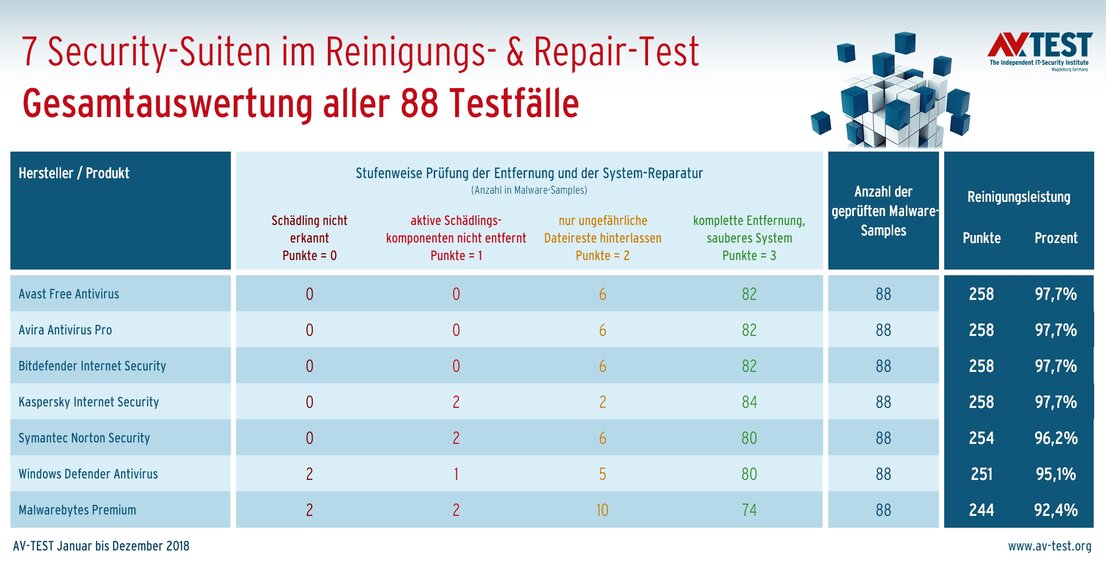 Bei den 7 geprüften Security-Suiten, gibt es gleich 3 erste Plätze mit einer Reinigungsleistung von jeweils 97,7 Prozent bei 88 Testfällen: Avast Free Antivirus, Avira Antivirus Pro und Bitdefender Internet Security. Sie reinigten jeweils 82 Systeme absolut sauber und hinterließen jeweils nur in 6 Fällen ungefährliche Dateireste. Das ist eine fast perfekte Leistung.