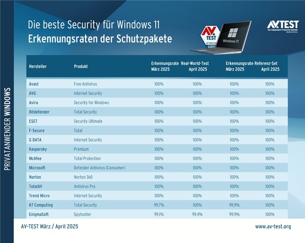 Wie gut am Markt verfügbare Schutzpakete die Systeme gegen alle möglichen Exemplare von Malware wappnen, hat das Labor von AV-TEST untersucht. Im aktuellen zweimonatigen Test von März bis April 2025 prüften die Experten 15 Security-Pakete auf ihre Schutzwirkung, Systembelastung und Benutzbarkeit. Jedes Produkt kann in jedem Bereich bis zu 6 Wertungspunkte ergattern und somit bis zu 18 Punkte erreichen. Alle Produkte mit 18 oder 17,5 Punkten erhalten dann nicht nur das Zertifikat „Certified“ für geprüfte Sicherheit, sondern auch noch zusätzlich die Auszeichnung TOP PRODUCT.