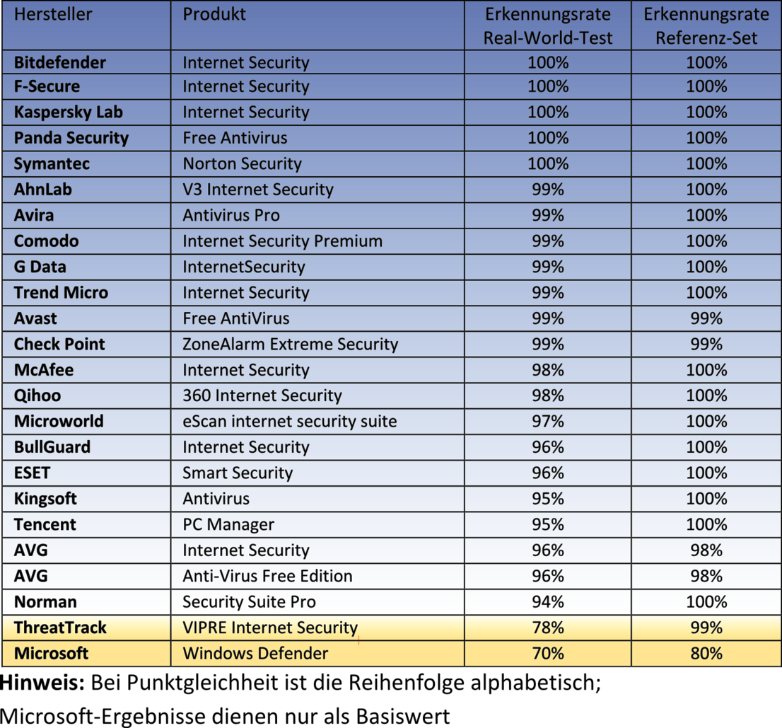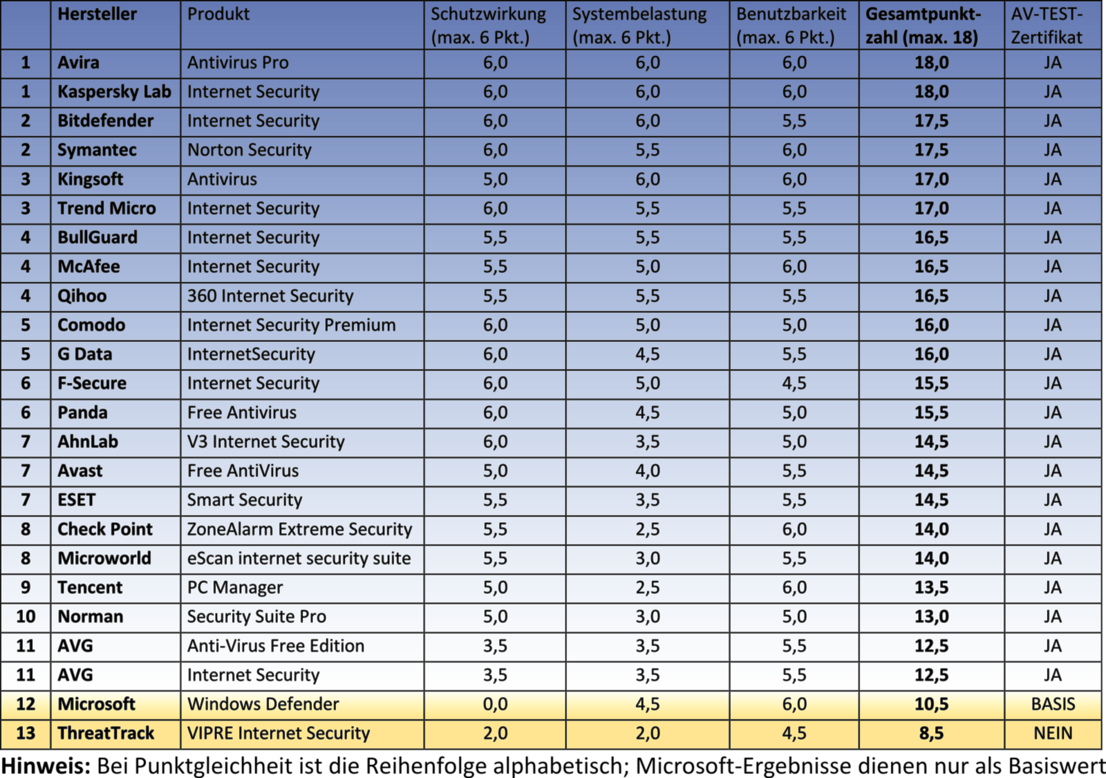 Der zum Vergleich mit getestete Basisschutz von Windows in Form des Windows Defenders bekam nur 10,5 Punkte. Für seine schwache Erkennungsleistung hatten die Tester keinerlei Punkte übrig.