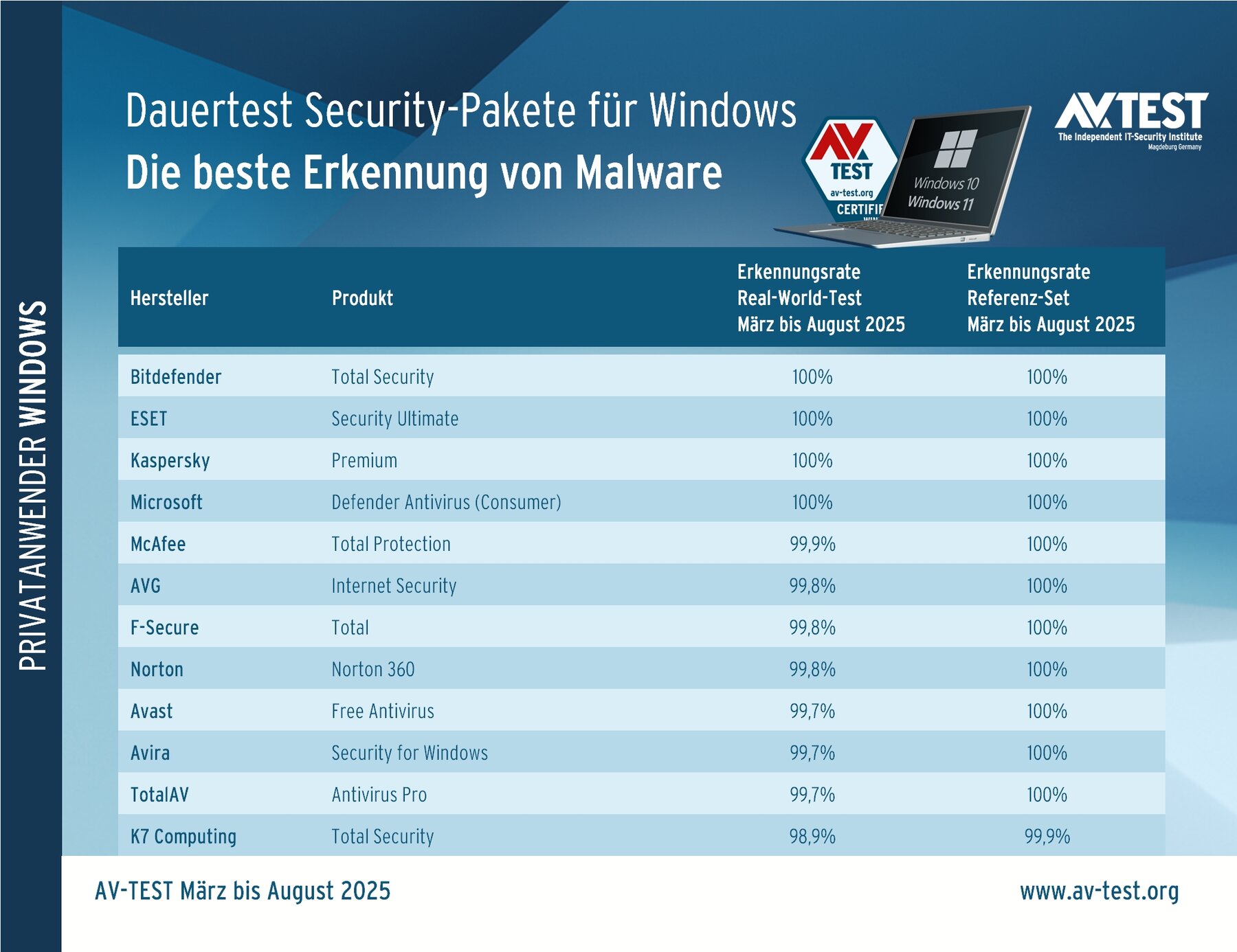 Microsoft hat die positive Nachricht verlauten lassen, dass der Support für die wichtigen Security-Updates für Windows 10 bis zum Oktober 2026 weiterläuft. Allerdings nur automatisch, wenn ein Nutzer unter Windows mit einem Konto angemeldet ist und sich bei den erweiterten Sicherheitsupdates (ESU) kostenlos angemeldet hat. Wer doch auf Windows 11 umsteigt, stellt sich oft die Frage, ob sein aktuell genutztes Schutzpaket unter Windows 11 funktioniert und dort genauso gut weiter schützt. Der Umstieg ist in der Regel kein Problem, denn die Hersteller bieten alle ein Softwarepaket für Windows 11 an, dass auch mit der aktuellen Schutzpaket-Lizenz arbeitet, die unter Windows 10 genutzt wird. Die zweite Frage: ist mein Schutzpaket unter Windows 11 genauso sicher wie unter Windows 10, klärt der aktuelle Dauertest mit 12 bekannten Schutzpaketen. Das Labor hat den Langzeittest über 6 Monate hinweg unter Windows 10 gestartet und unter Windows 11 beendet. Der Labortest lief von März bis August 2025.