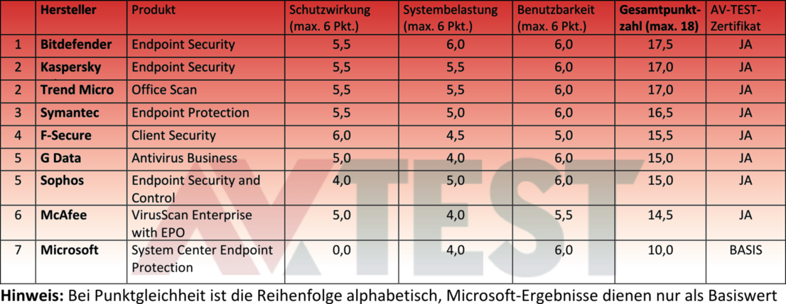 Die höchste erreichbare Punktzahl für Schutzwirkung, Systembelastung und Benutzbarkeit im Test lag bei 18 Punkten. Diesen Wert hat die Schutz-Lösung von Bitdefender mit 17,5 Punkten nur knapp verfehlt. Mit je 17 Punkten folgen die Systemwächter für Unternehmen von Kaspersky Lab und Trend Micro. Rang 3 schaffte Symantec mit insgesamt 16,5 Punkten.