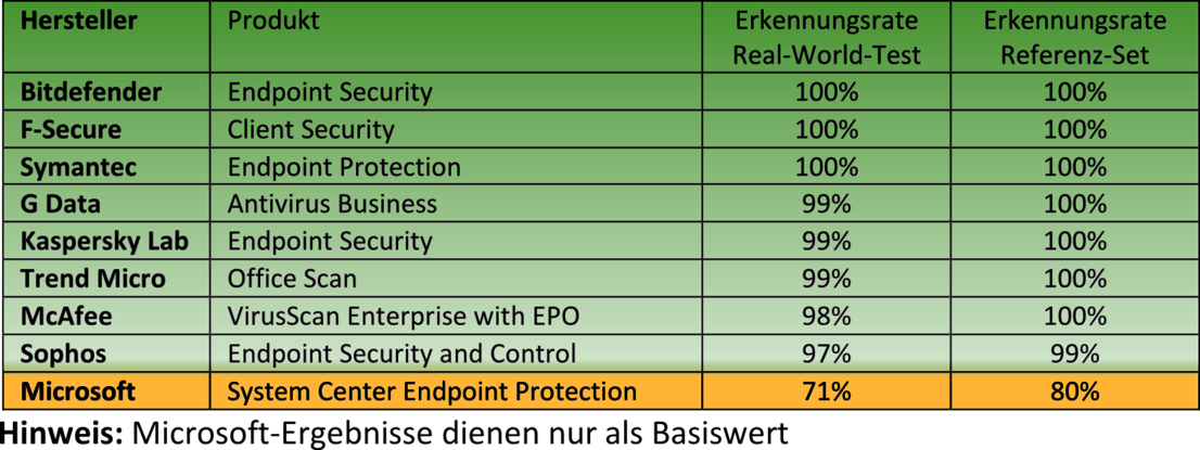 Die zum Vergleich mit getestete System Center Endpoint Protection von Microsoft ist keine empfehlenswerte Alternative. Die Leistung bei der Erkennung von Schädlingen ist mit 71 bzw. 80 Prozent zu gering. Die Spitzenplätze leisten hier zwischen 99 und 100 Prozent.