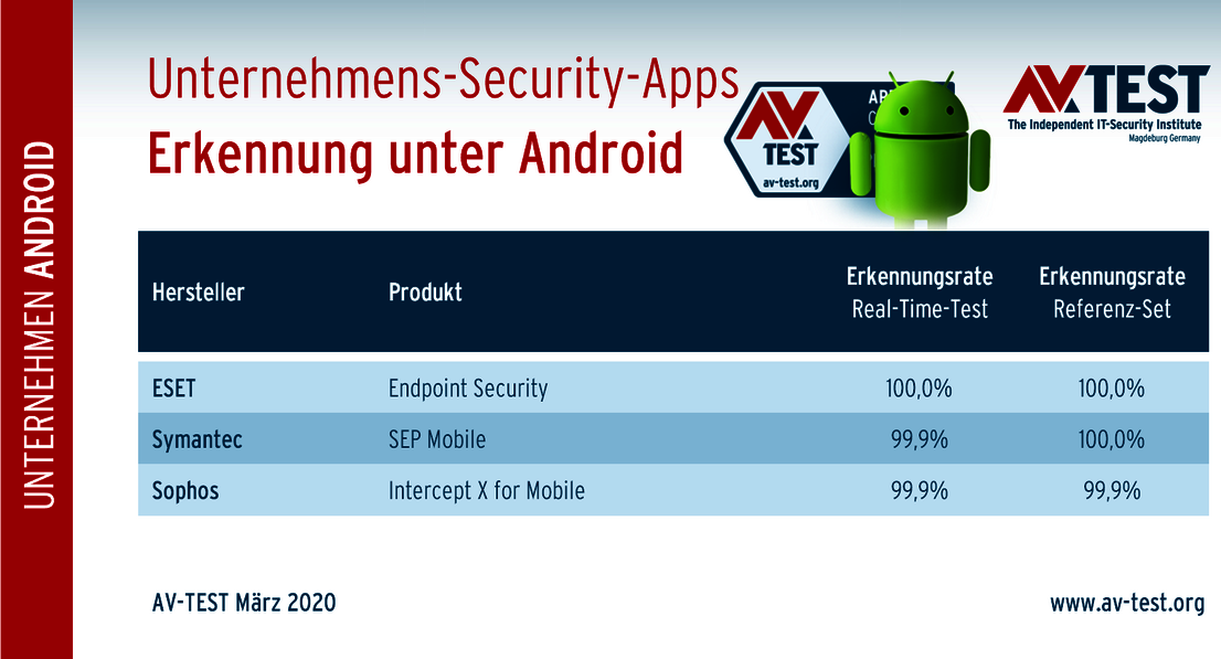 Bei der Untersuchung der Schutzwirkung für Unternehmens-Apps setzt das Labor auf das gleiche System wie bei den Apps für private Nutzer. Für den Real-Time-Test wurden jeweils über 3.100 brandneue, schädliche Apps aus dem Internet gefiltert. Im zweiten Testabschnitt, mit dem Referenz-Set, prüft das Labor die Schutz-Apps für Unternehmen mit über 3.000 bis zu 4 Wochen alten, besonders gefährlichen Apps. An dieser Stelle gibt es kleine Unterschiede zu den Prüfungen für private Nutzer: in den Test-Sets stecken in der Regel wenige bis keine verseuchten Spiele-Apps, da diese selten auf Firmen-Smartphones installiert werden. Dafür befinden sich in den Sets mehr Programme, die in der Regel auf Unternehmen-Smartphones landen. Der Test mit Schutz-Tools für private Nutzer prüft natürlich im Umkehrschluss mehr verseuchte Apps aus dem Spiele-Bereich.