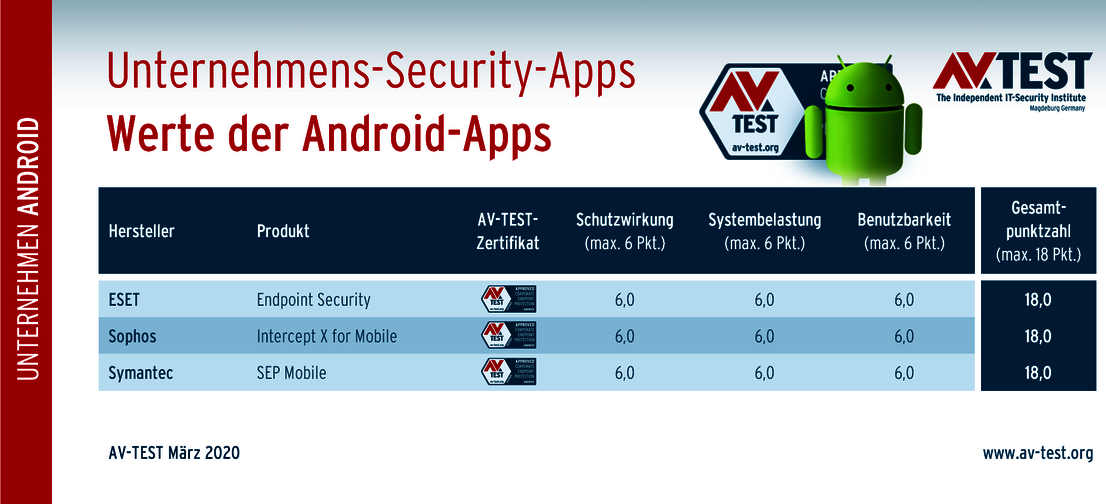 Viele Unternehmen sichern ihre Desktops, Server und Notebooks gerne per Endpoint-Security-Lösung ab. Viel zu oft wurden dabei die mobilen Geräte mit Android vernachlässigt. Für einen vollständigen Schutz hat jeder namhafte Anbieter von Security-Lösungen auch Android-Apps im Portfolio. Gerade wenn Mitarbeiter keine gestellten Firmengeräte nutzen, sondern ihr eigenes mobiles Gerät, steigt das Risiko für ein Unternehmen. Auch bei BYOD (Bring-Your-Own-Device) lässt sich ein privates Mitarbeitergerät so absichern, wie es sein sollte. Denn die Endpoint-Security-Apps überwachen auch viele weitere Funktionen auf den Geräten und geben oft Regeln vor. In Sachen Schutzwirkung, Systemlast und Benutzbarkeit sind die aktuell geprüften Security-Apps der Unternehmenslösungen von ESET, Sophos und Symantec eine sichere Sache. Die Apps schließen in allen Testbereichen mit der maximalen Punktzahl von 6 ab und erreichen so den Bestwert von 18 Punkten.