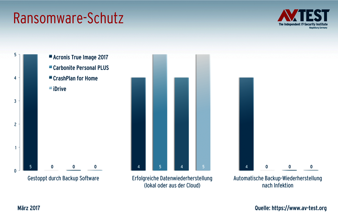Der Test zeigt eindeutig, dass sinnvoller Malware-Schutz den Einsatz von Backup-Software beinhalten sollte. Als einzige Backup-Lösung im Test kann „Acronis True Image 2017 New Generation Premium“ Ransomware stoppen. Darum sowie aufgrund hervorragender Testergebnisse im Prüfpunkt Backup-Funktionalität erhält das Programm das Zertifikat „Approved Backup & Data Security Software“ des AV-TEST Institutes. Es unterstützt Nutzer klar bei der Verteidigung des eigenen PC-Systems und wichtiger Daten, ohne allzu viel Einsatz zu verlangen. Die umfangreiche Sicherheitsstudie zum Test lässt sich auch in dieser PDF-Datei (in Englisch) nachlesen, die das Labor ausgearbeitet hat.