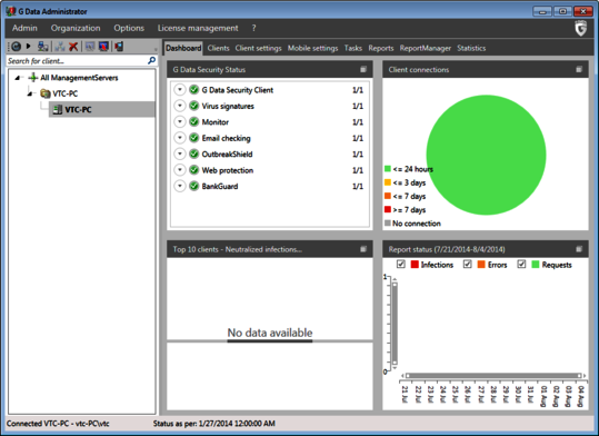 During July and August 2014 we continuously evaluated 9 endpoint protection products using settings as provided by the vendor. We always used the most current publicly-available version of all products for the testing. They were allowed to update themselves at any time and query their in-the-cloud services. We focused on realistic test scenarios and challenged the products against real-world threats. Products had to demonstrate their capabilities using all components and protection layers.