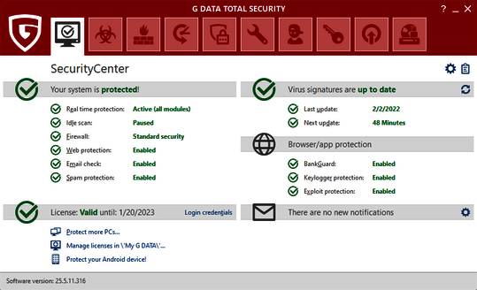 During January and February 2022 we continuously evaluated 18 home user security products using their default settings. We always used the most current publicly-available version of all products for the testing. They were allowed to update themselves at any time and query their in-the-cloud services. We focused on realistic test scenarios and challenged the products against real-world threats. Products had to demonstrate their capabilities using all components and protection layers.