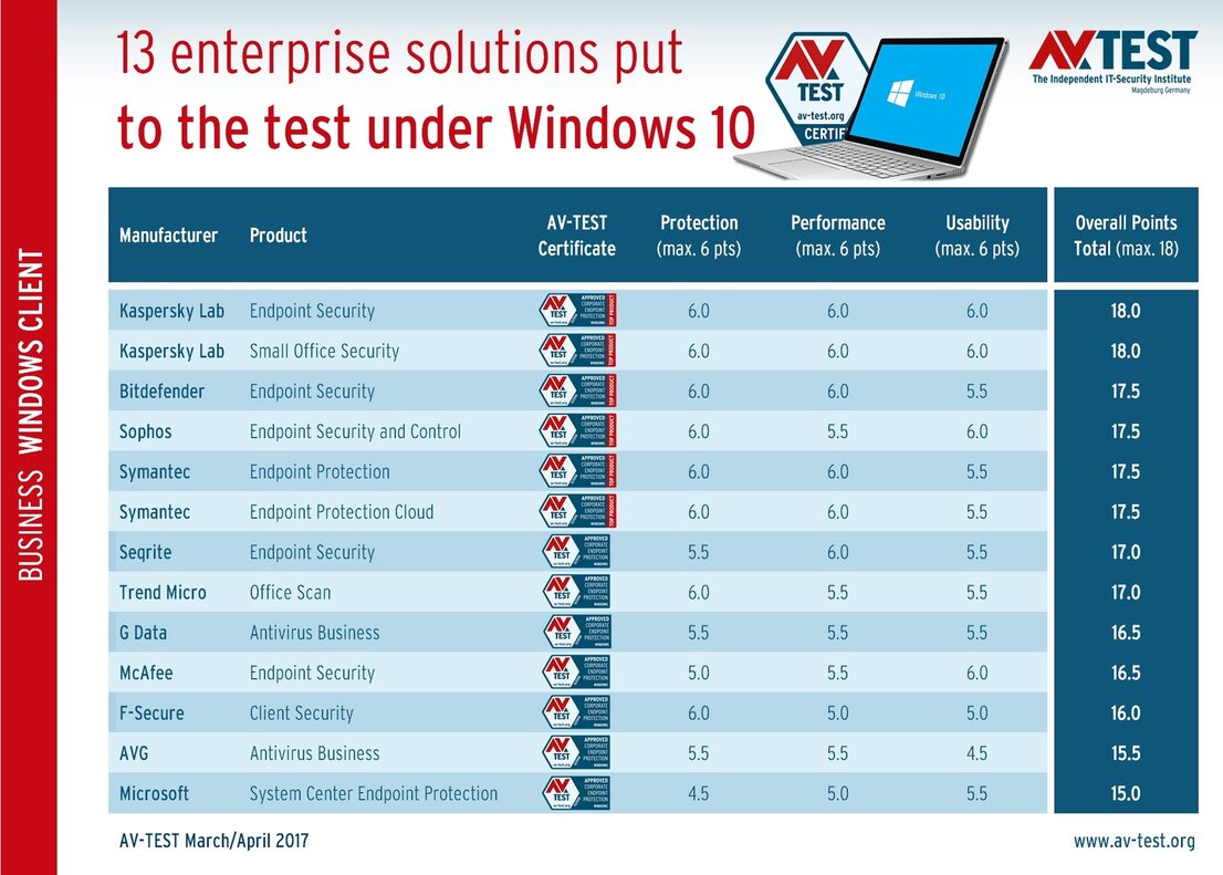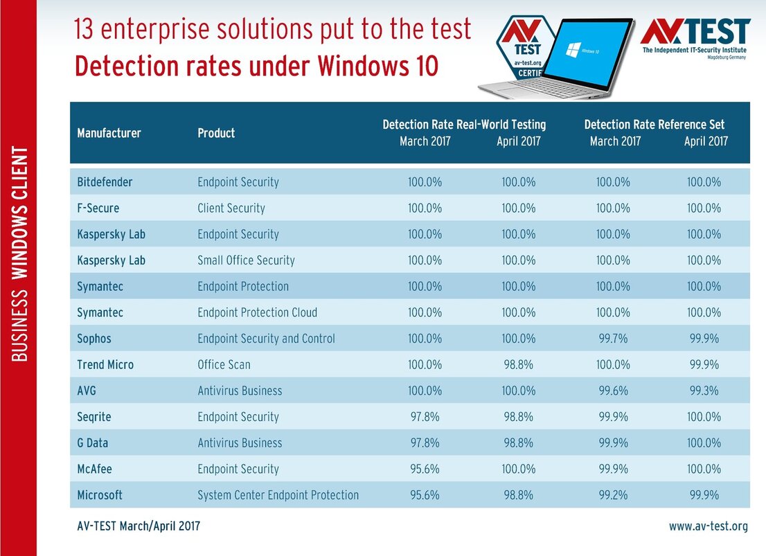 Windows 10 is deployed in more and more companies. The laboratory of AV-TEST tested 13 corporate solutions for Windows 10 in terms of their protection, performance and usability. The results are impressive.