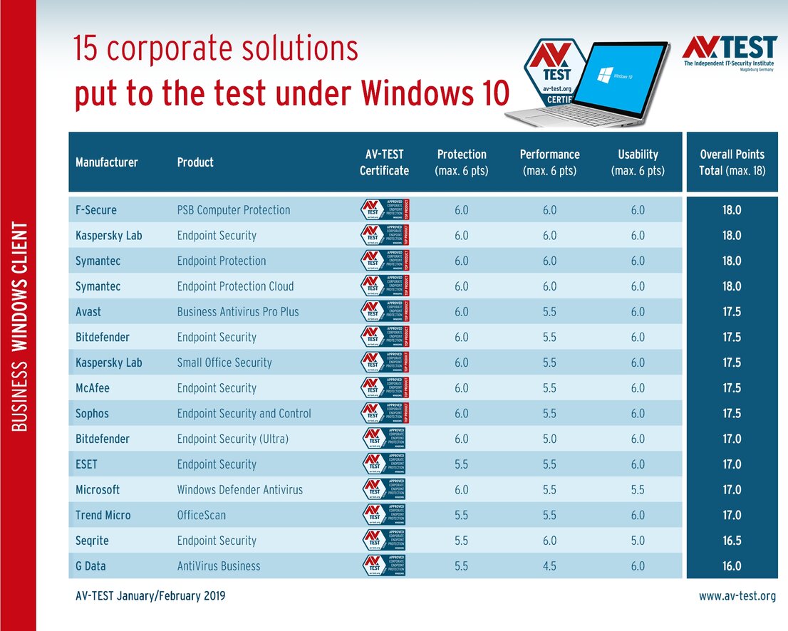 It took a long time, but now Windows 10 has definitely also arrived among corporate users. Various statistics portals see Windows 10 being used in roughly two thirds of company PCs, and this number continues to increase. This trend is naturally also linked to the end of support for Windows 7 in 2020. In both January and February, the laboratory of AV-TEST tested 15 security solutions for corporate users in terms of their protection, performance and usability on Windows 10 clients. For each solution, it was possible to achieve up to 6 points per test phase, i.e. 18 in total.