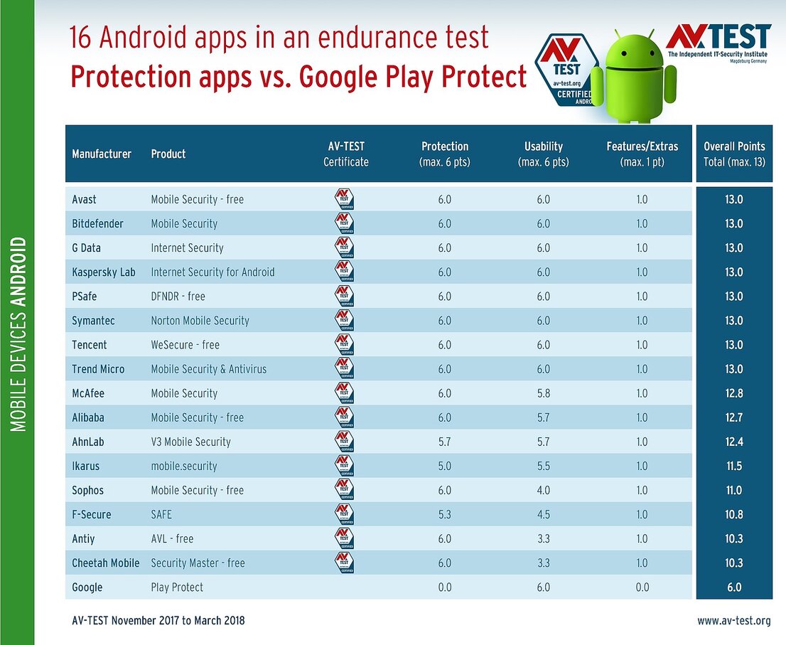 he additional apps from Ikarus, Sophos, F-Secure, Antiy, and Cheetah Mobile achieved 11.5 to 10.3 points out of 13. Last place finisher is Google Play Protect with a total of only 6 points
