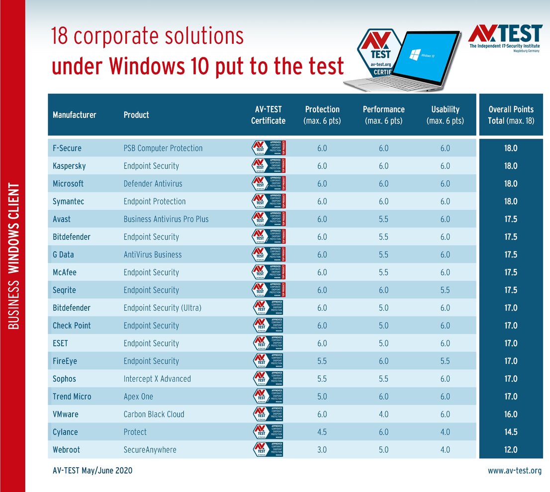 With 18 points, the solutions from F-Secure, Kaspersky, Microsoft, and Symantec shared first place. In hot pursuit at 17.5 points were the corporate products from Avast, Bitdefender (Endpoint Security), G Data, McAfee and Seqrite.