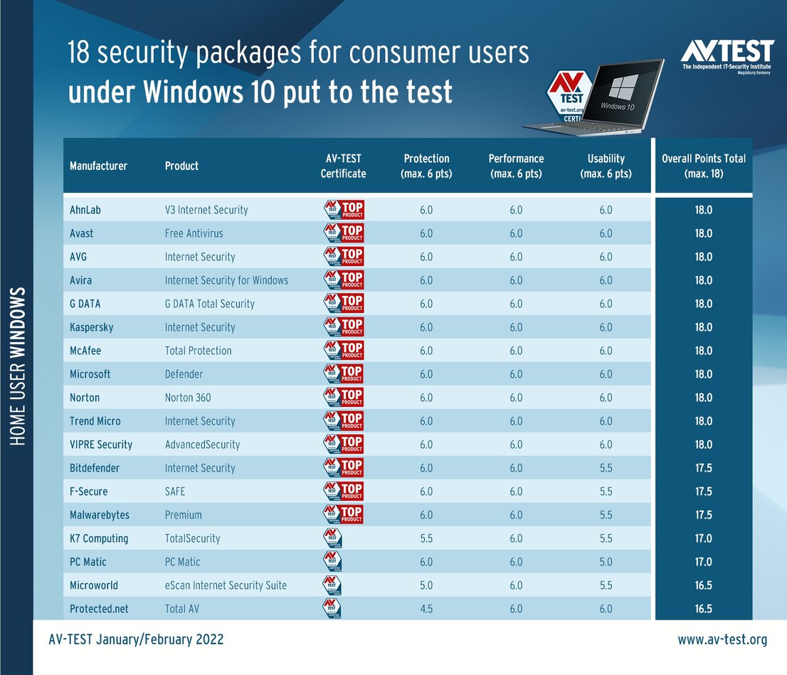 In this test, the lab at AV-TEST evaluated 18 security packages in terms of their protection, performance and usability. The last category primarily involved the test for false alarms. Each product was tested in two successive months, and the results were aggregated. The test with the 18 security products took place in the lab in January and February 2022 under Windows 10. Included in the test were security packages and Internet security suites from AhnLab, Avast, AVG, Avira, Bitdefender, F-Secure, G DATA, K7 Computing, Kaspersky, Malwarebytes, McAfee, Microsoft, Microworld, Norton, PC Matic, Protected.net, Trend Micro and VIPRE Security.