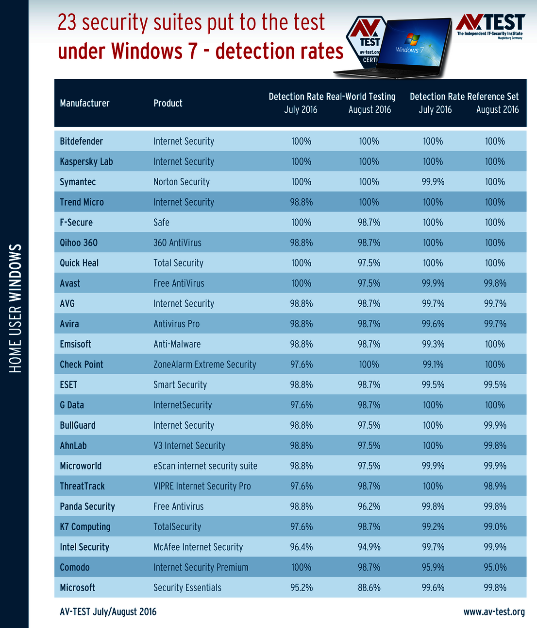 For the enormously large user group of Windows 7, AV-TEST tested 23 current security packages in two separate rounds of tests in July and August, and issued security certificates. The best news up front: despite the high number of products tested, there was no total failure. The test does once again prove, however, that some manufacturers are extremely diligent, whereas others apparently are not.