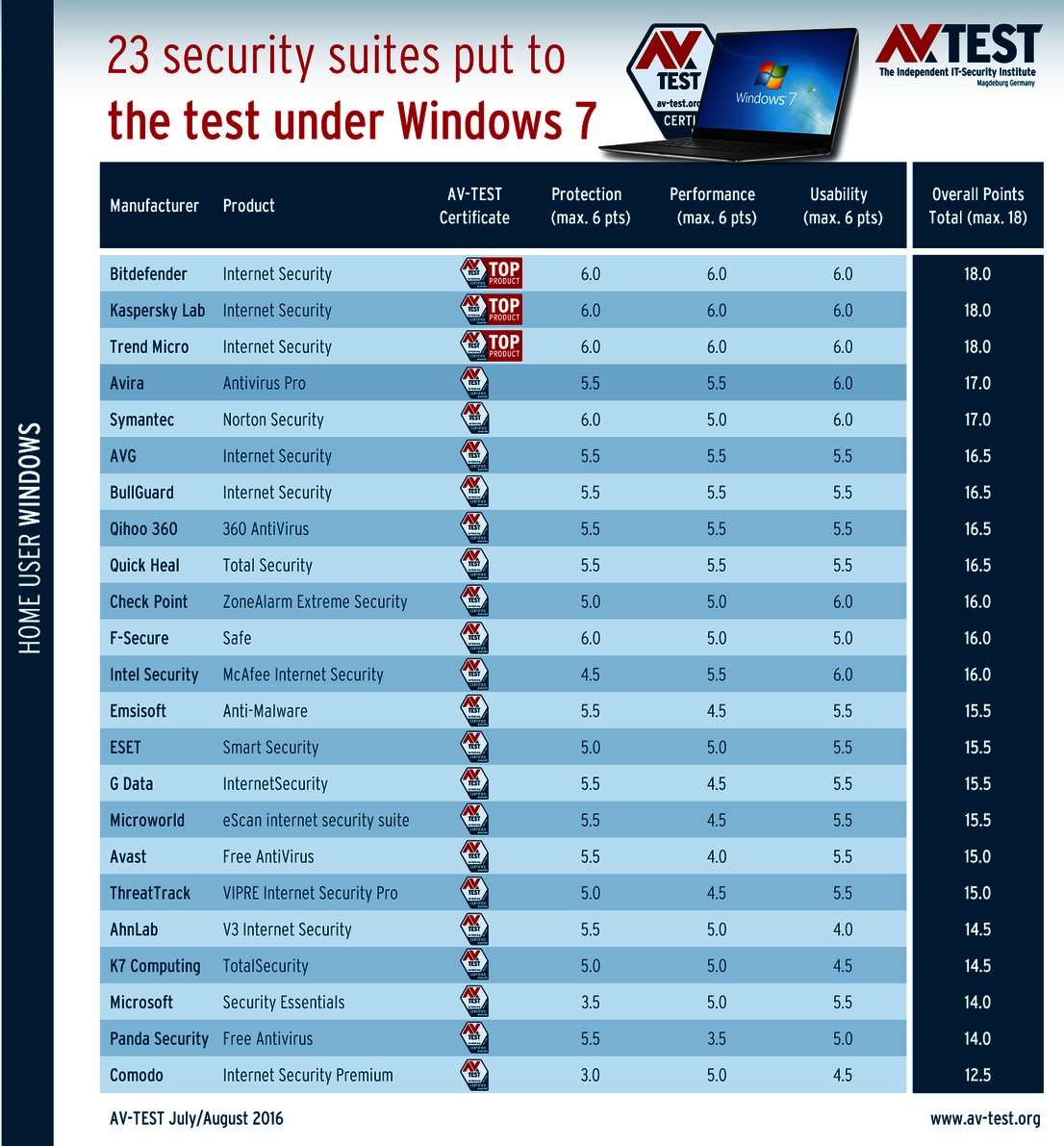 This stellar performance, however, was reached only by the packages from Bitdefender, Kaspersky Lab and Trend Micro. This is followed by the solutions from Avira and Symantec, with excellent results of 17 points. The best freeware solution came from Avast, attaining what was still a decent result of 15 points. While the freeware Qihoo 360 performed better, the tested version was only available in Chinese.