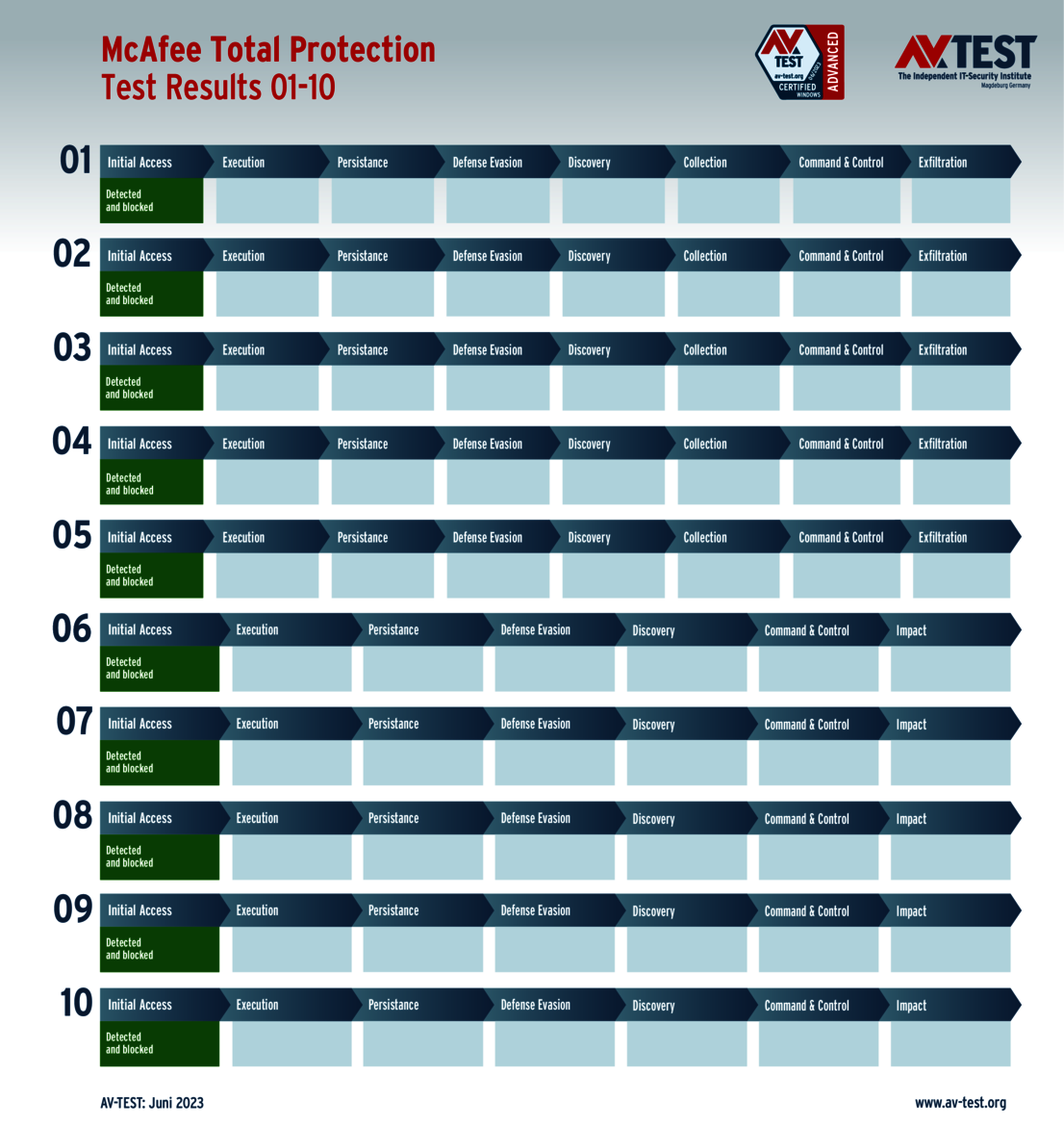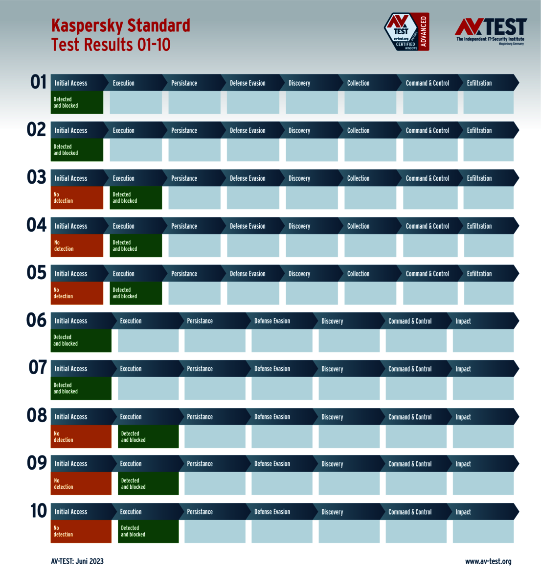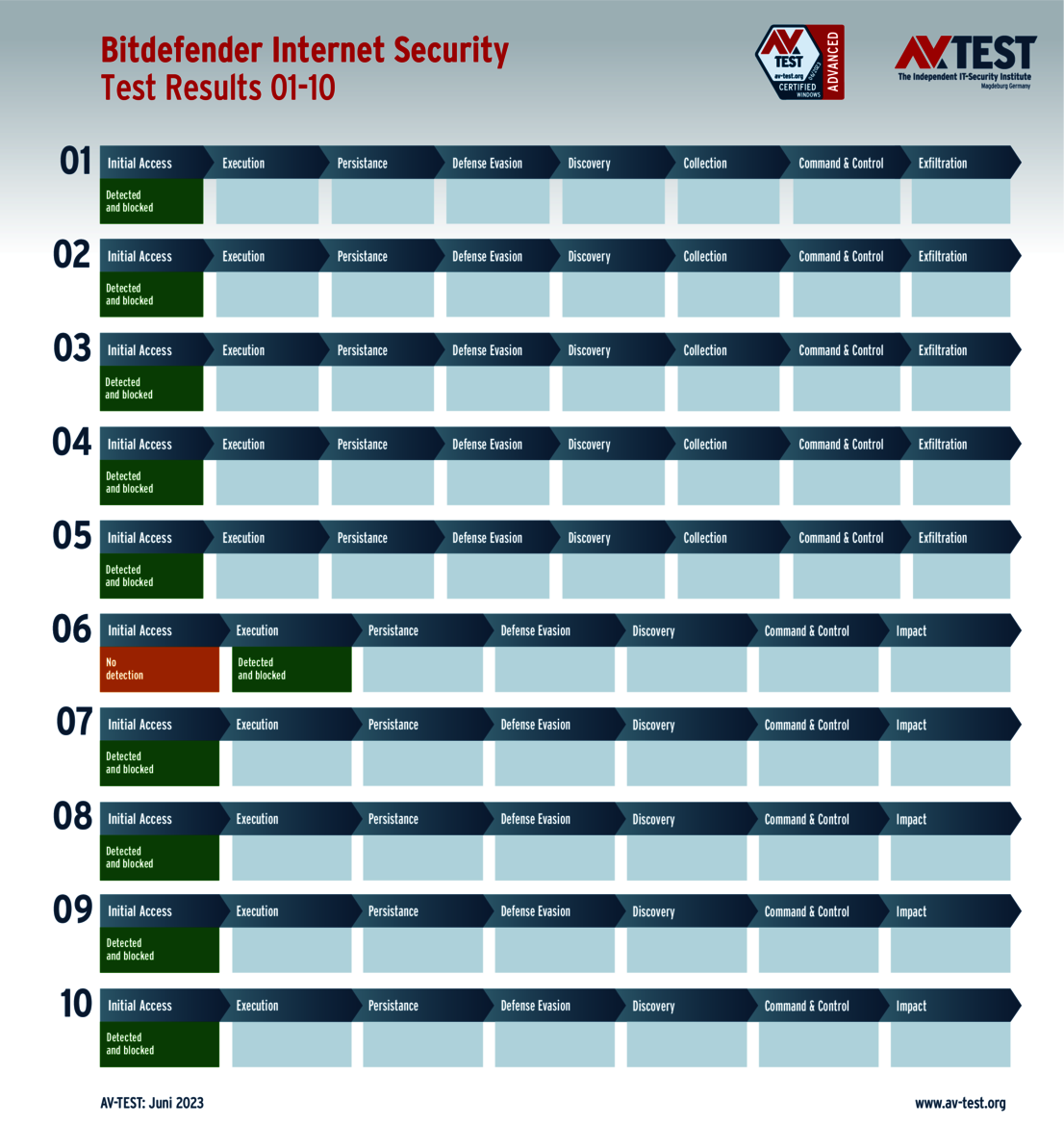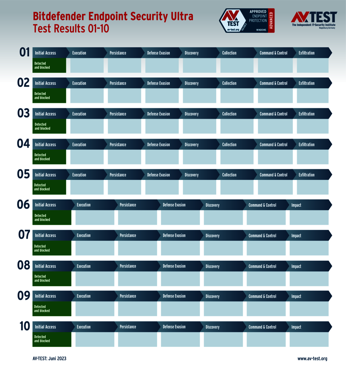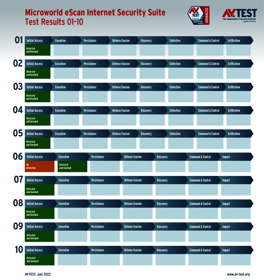 All attack scenarios are documented according to the standard of the MITRE ATT&CK database. The individual sub-techniques, for example "T1566.001", are listed in the MITRE database for "Techniques" under "Phishing: Spearphishing Attachment". Each test step is thus defined among the experts and can be logically understood. In addition, all attack techniques are explained, along with how successful the malware is.