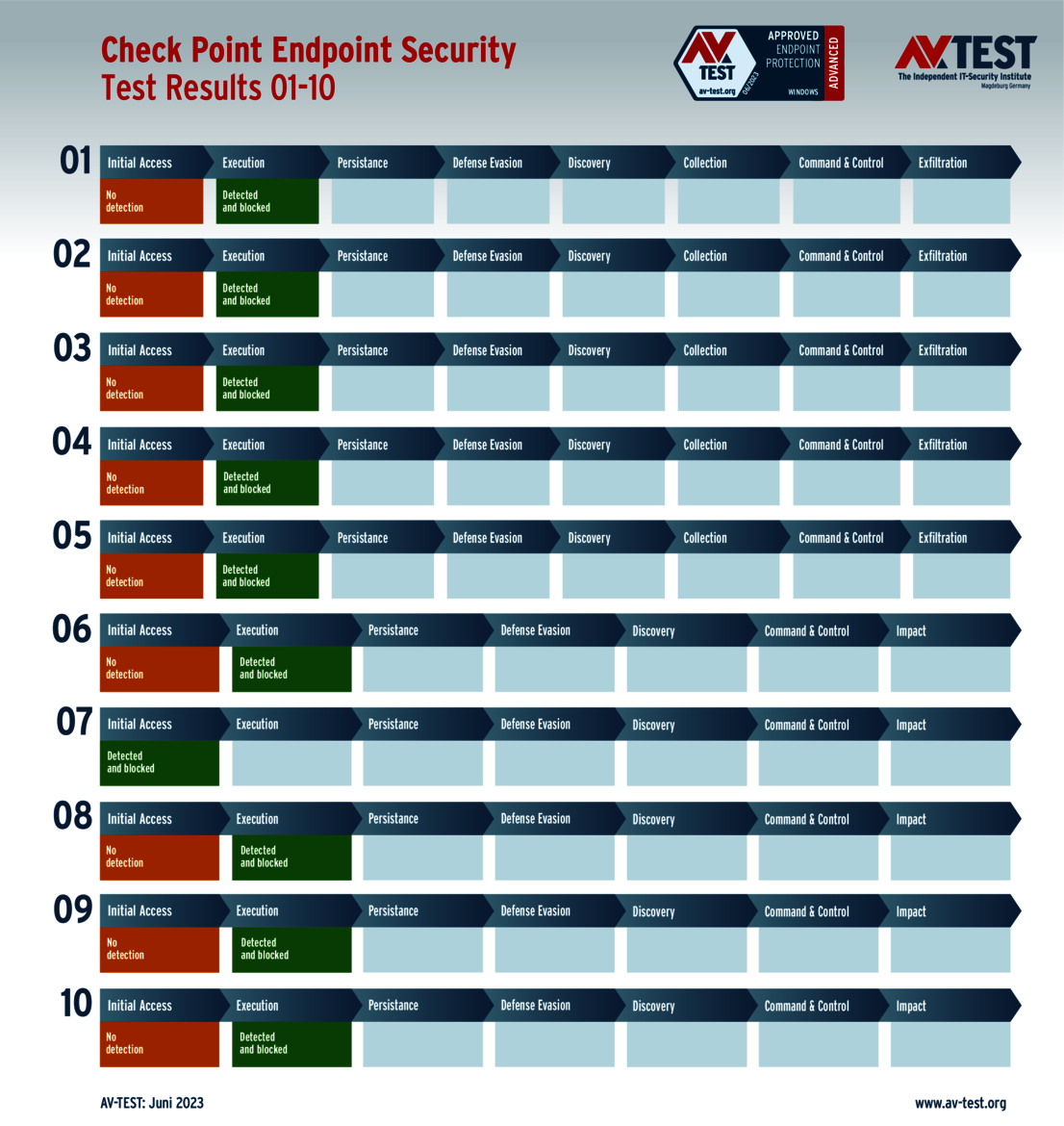 In its May-June test, AV-TEST examined 27 products under laboratory conditions in its Advanced Threat Protection test. In doing so, the experts went far beyond the classic detection test – just as a protection solution does as well. For in addition to basic detection, the products use sophisticated techniques for detection and defense, such as EDR, Endpoint Detection and Response, for example. That is why an attack may be fended off in later steps, although the detection did not trigger in the initial step.