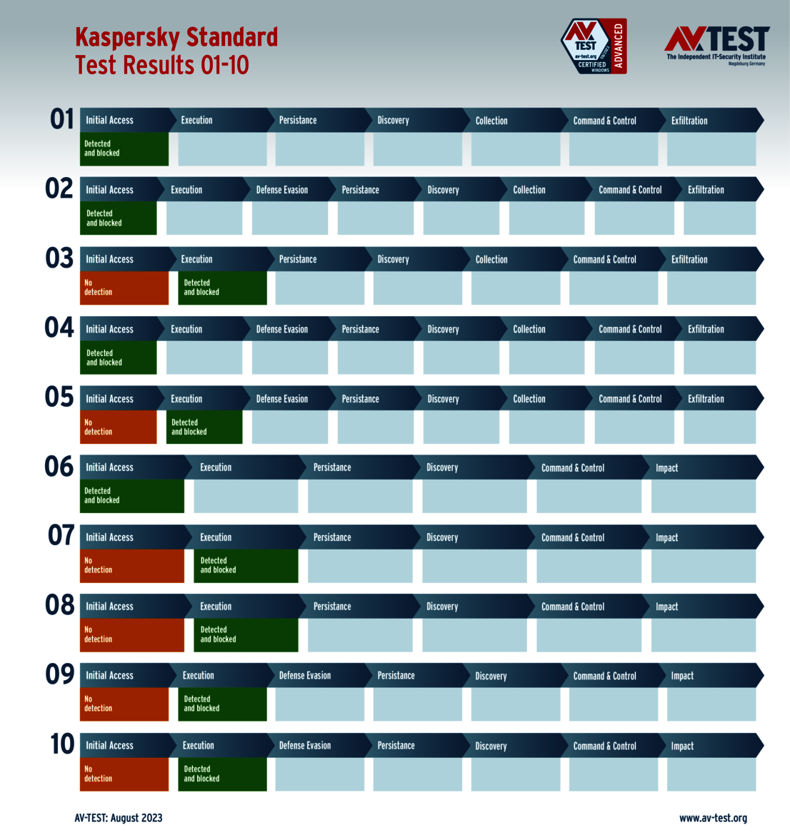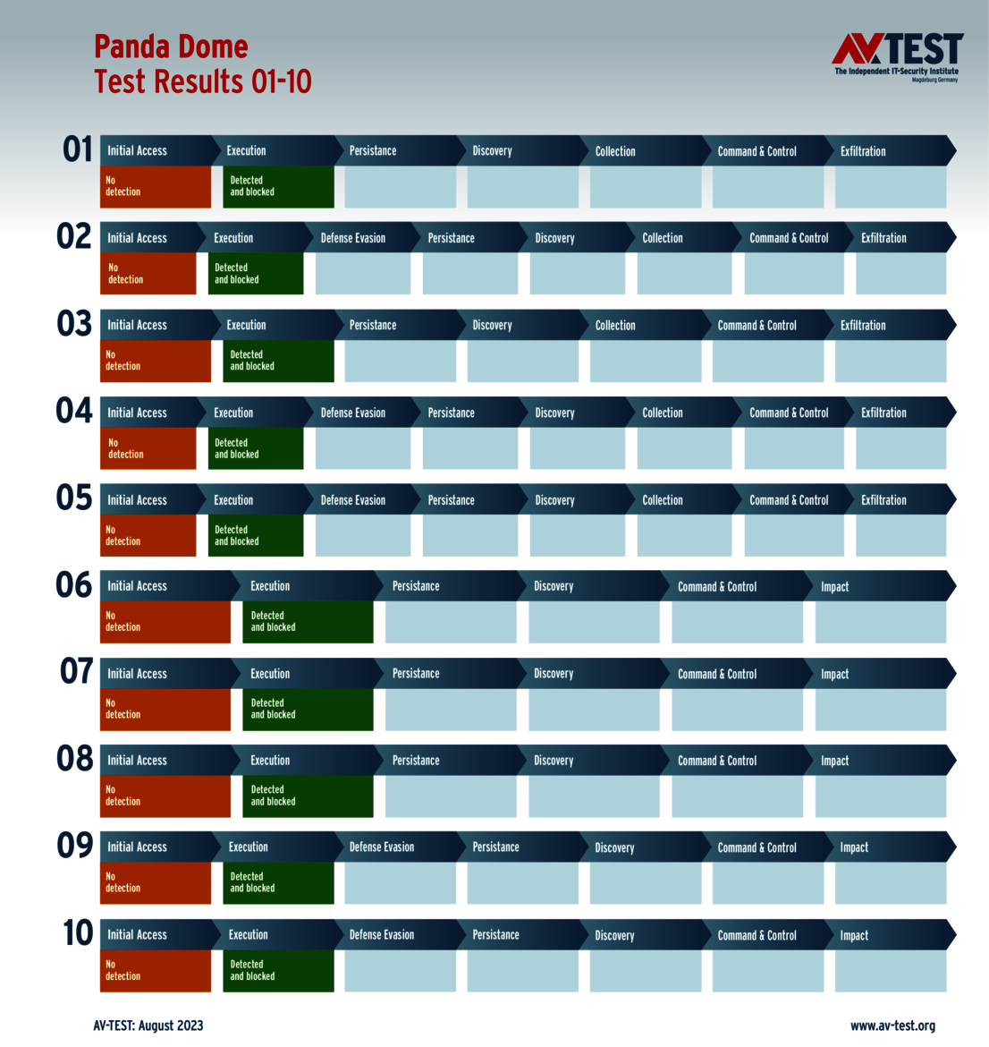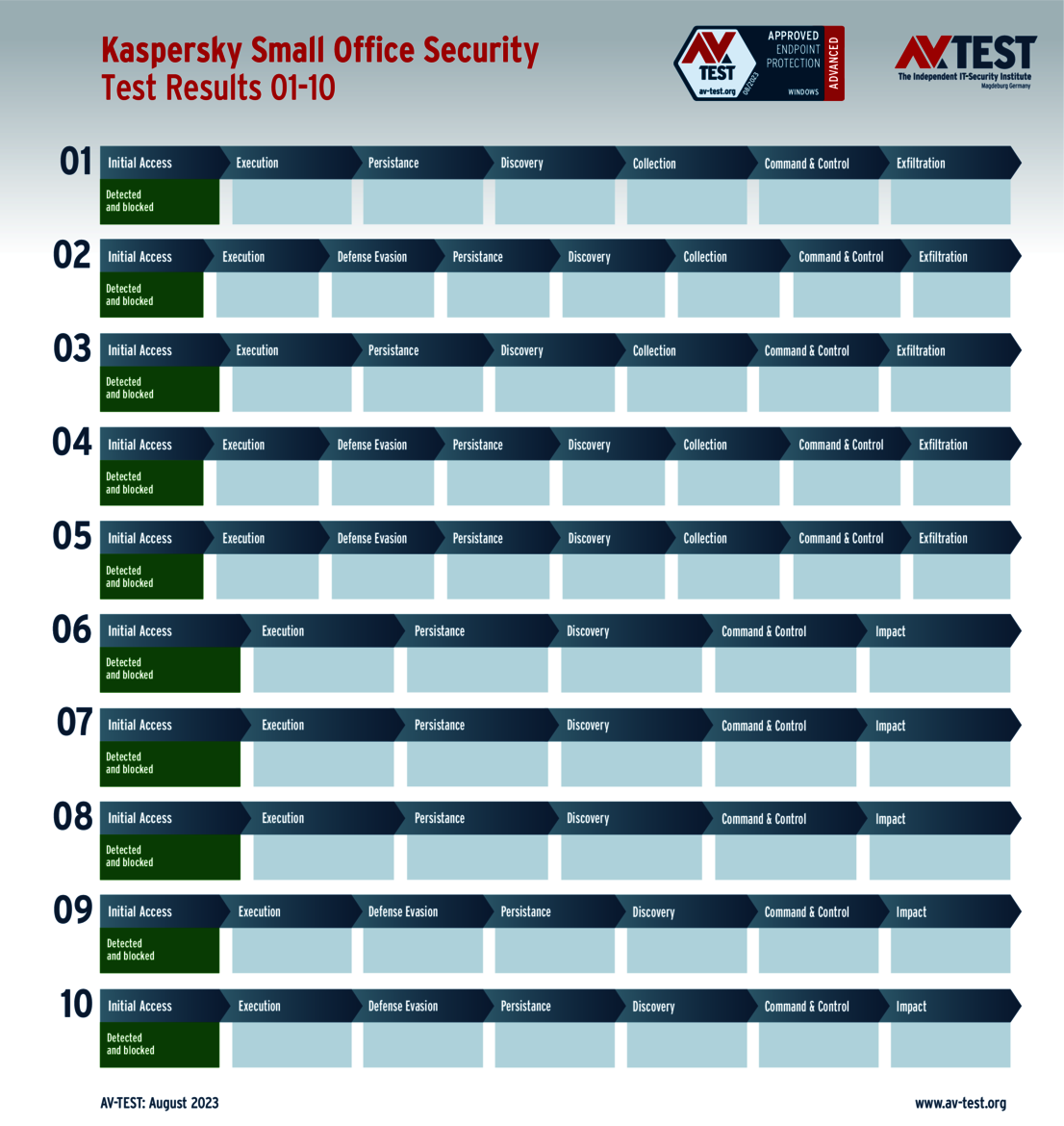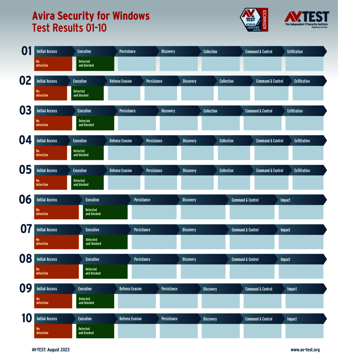 In the 10 test scenarios, the attackers deployed the latest techniques, such as DNS TXT Record, encrypted connections or even the Rust programming language. But the protection programs know all these variants and respond accordingly in the detection and defense. All in all: nearly exemplary performance!