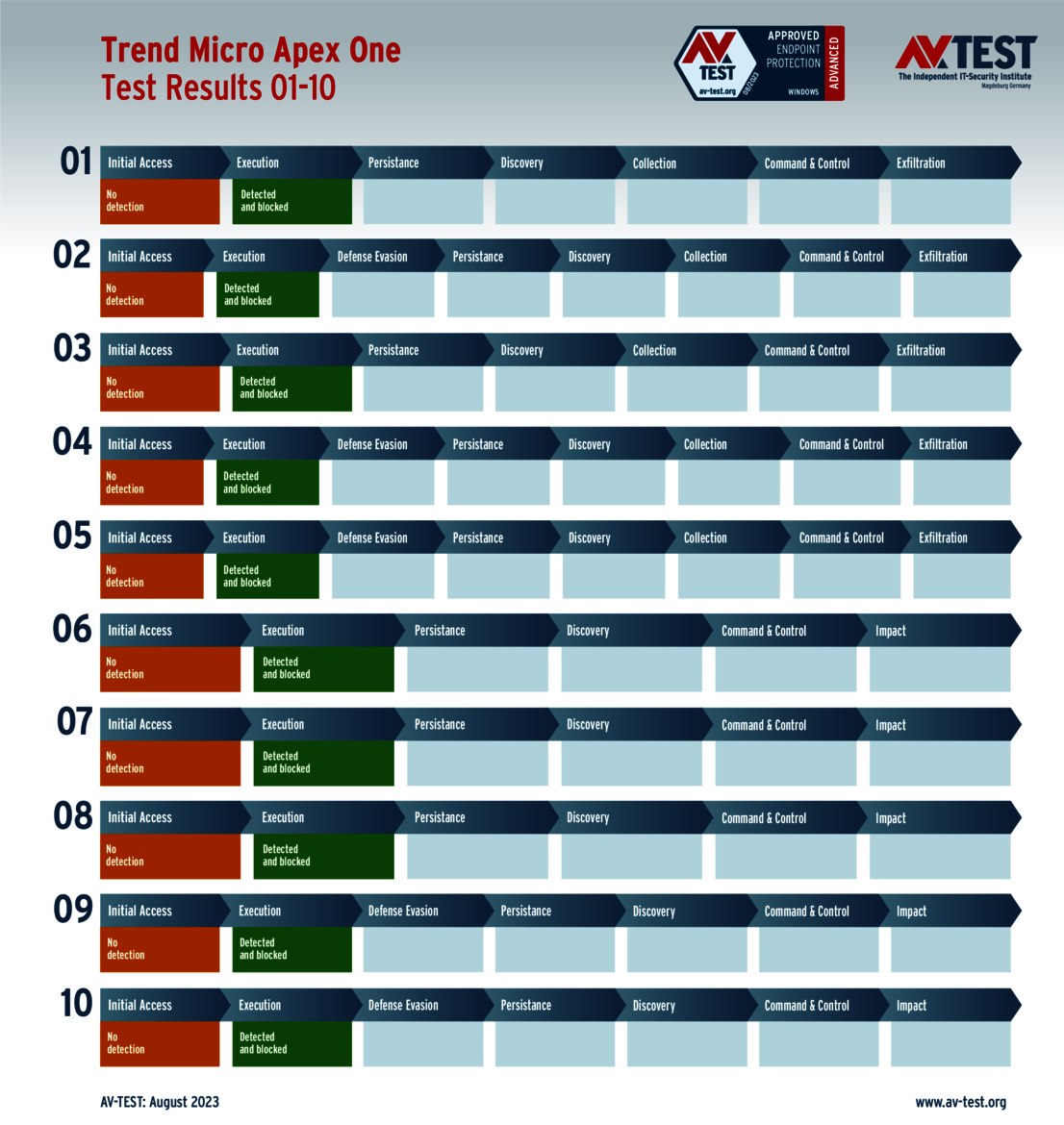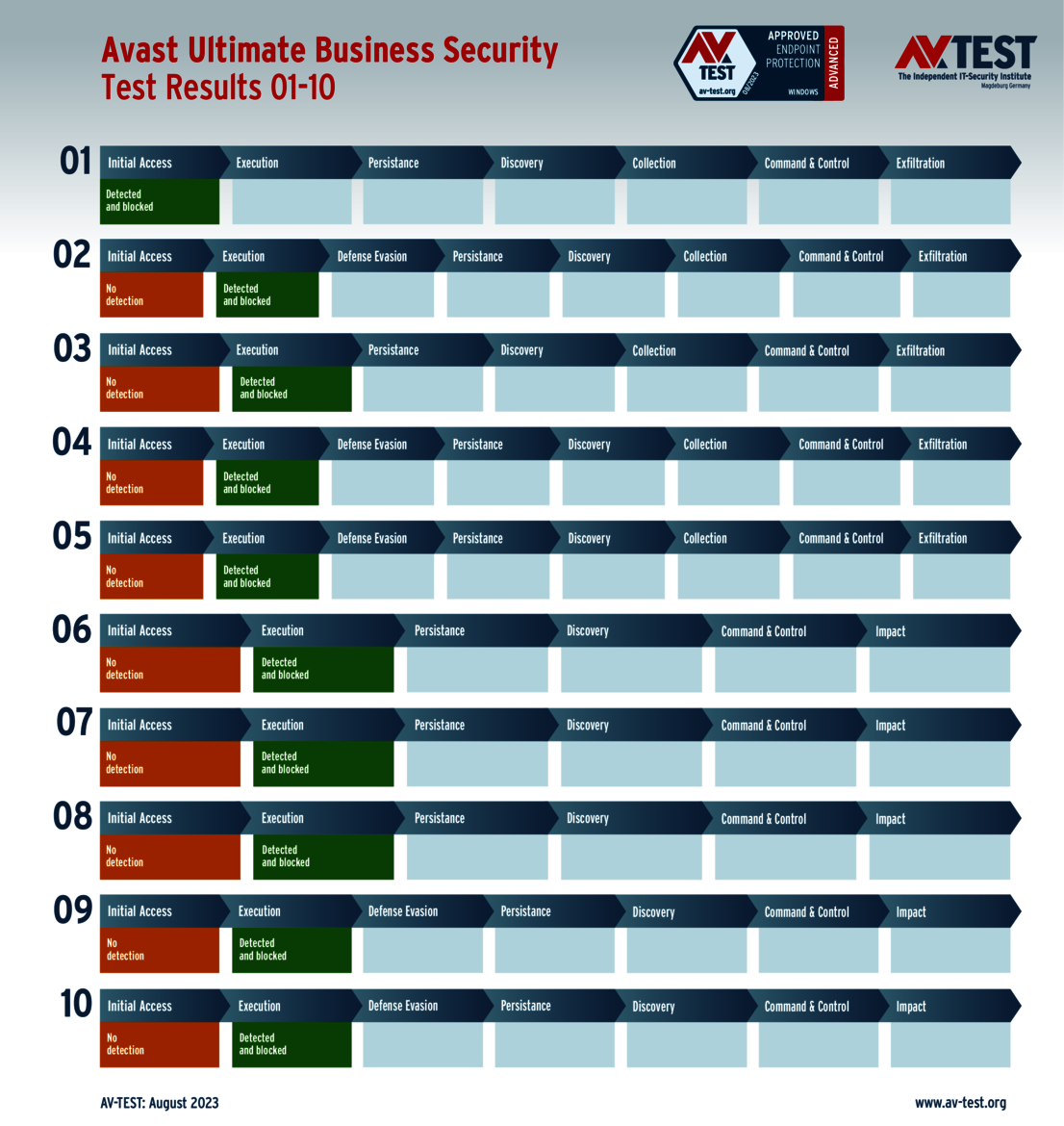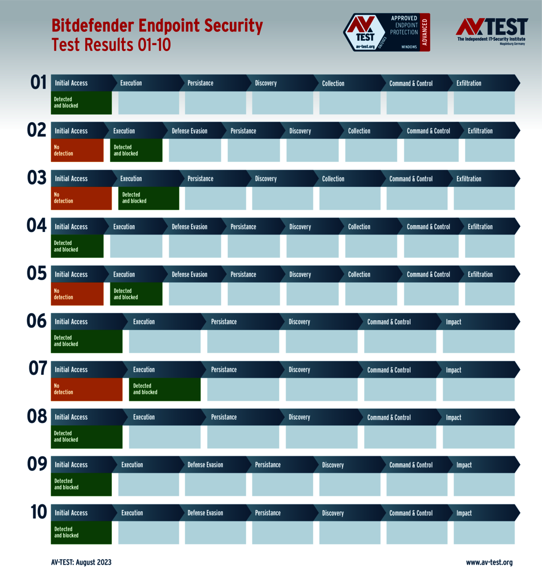 In the 10 test scenarios, the attackers deployed the latest techniques, such as DNS TXT Record, encrypted connections or even the Rust programming language. But the protection programs know all these variants and respond accordingly in the detection and defense. All in all: nearly exemplary performance!