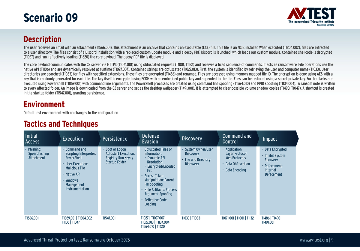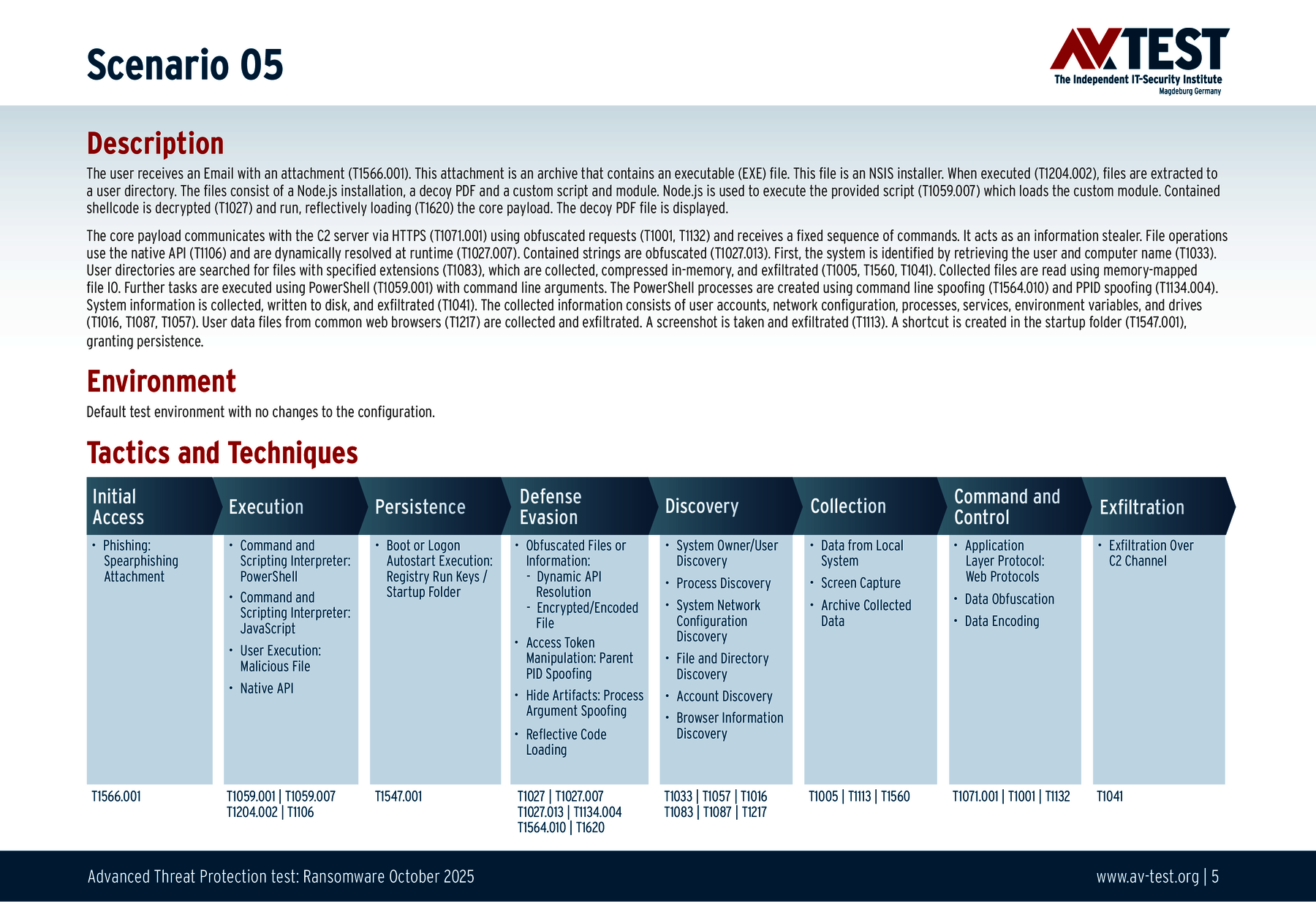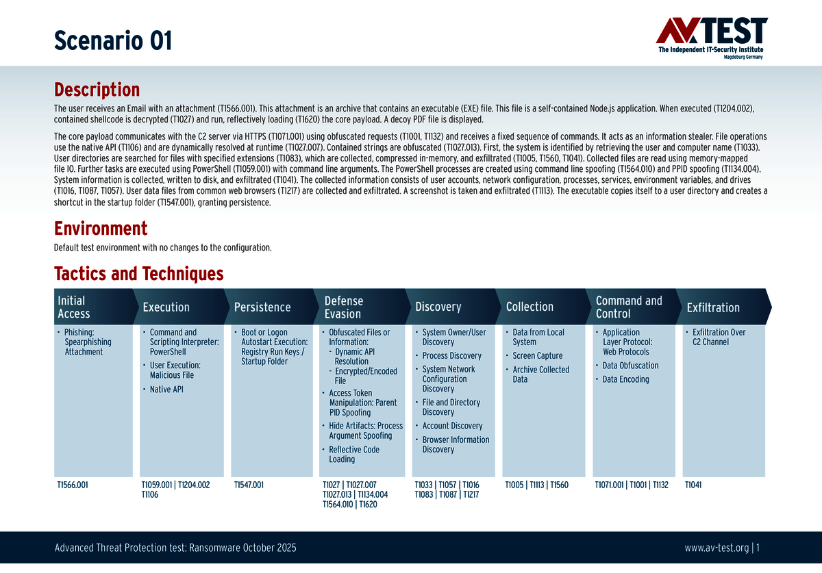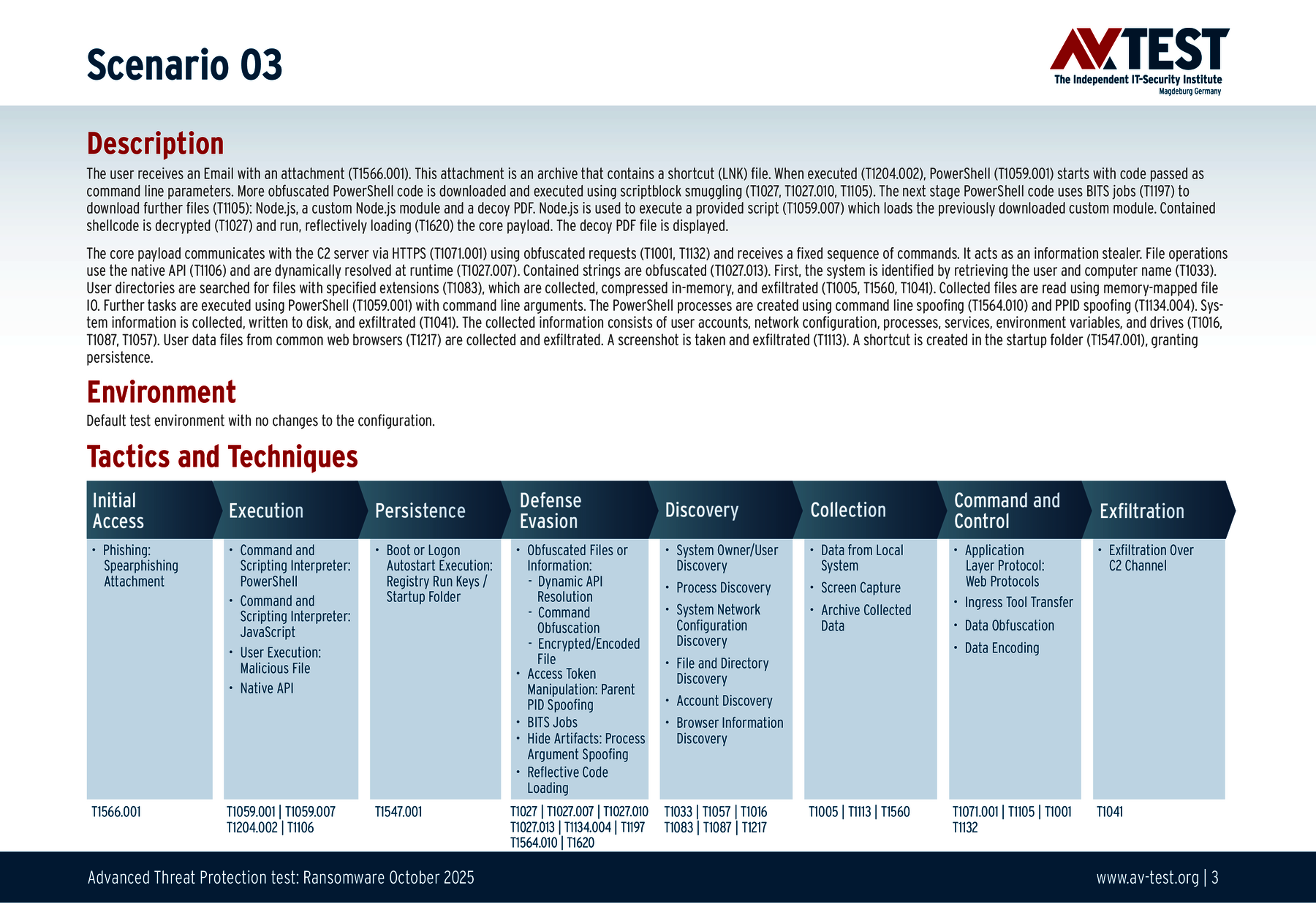 All attack scenarios are documented according to the standard of the MITRE ATT&CK database. The individual sub-techniques are listed in the MITRE database for “Techniques”, for example, “T1566.001” under “Phishing: Spearphishing Attachment”. Each test step is thus defined among the experts and can be logically understood. In addition, all attack techniques are explained, along with how the malware infection occurs and impacts systems.