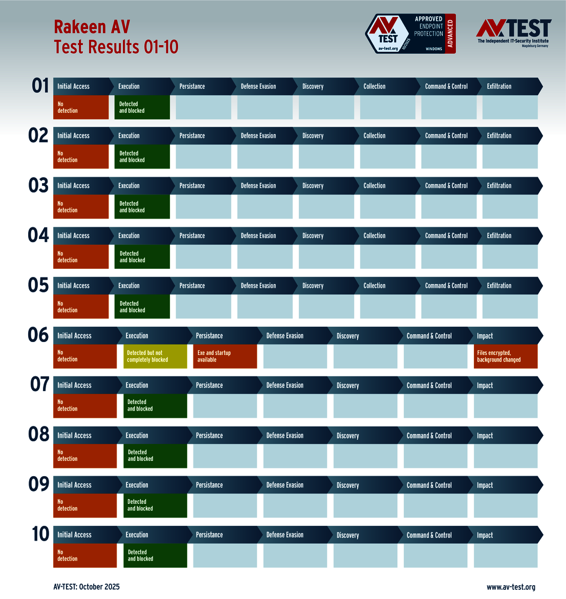 Rakeen ran into a similar situation with one ransomware. It managed to detect it; however, it couldn’t completely stop it. Some of the active components were able to spread to other parts of the system and encrypt individual files. In this case, the product only earned 0.5 out of 3 points possible, attaining a total score of 32.5 points in terms of protection.