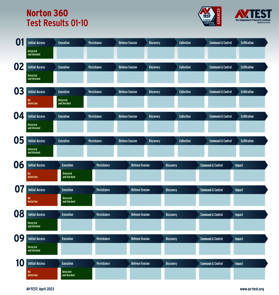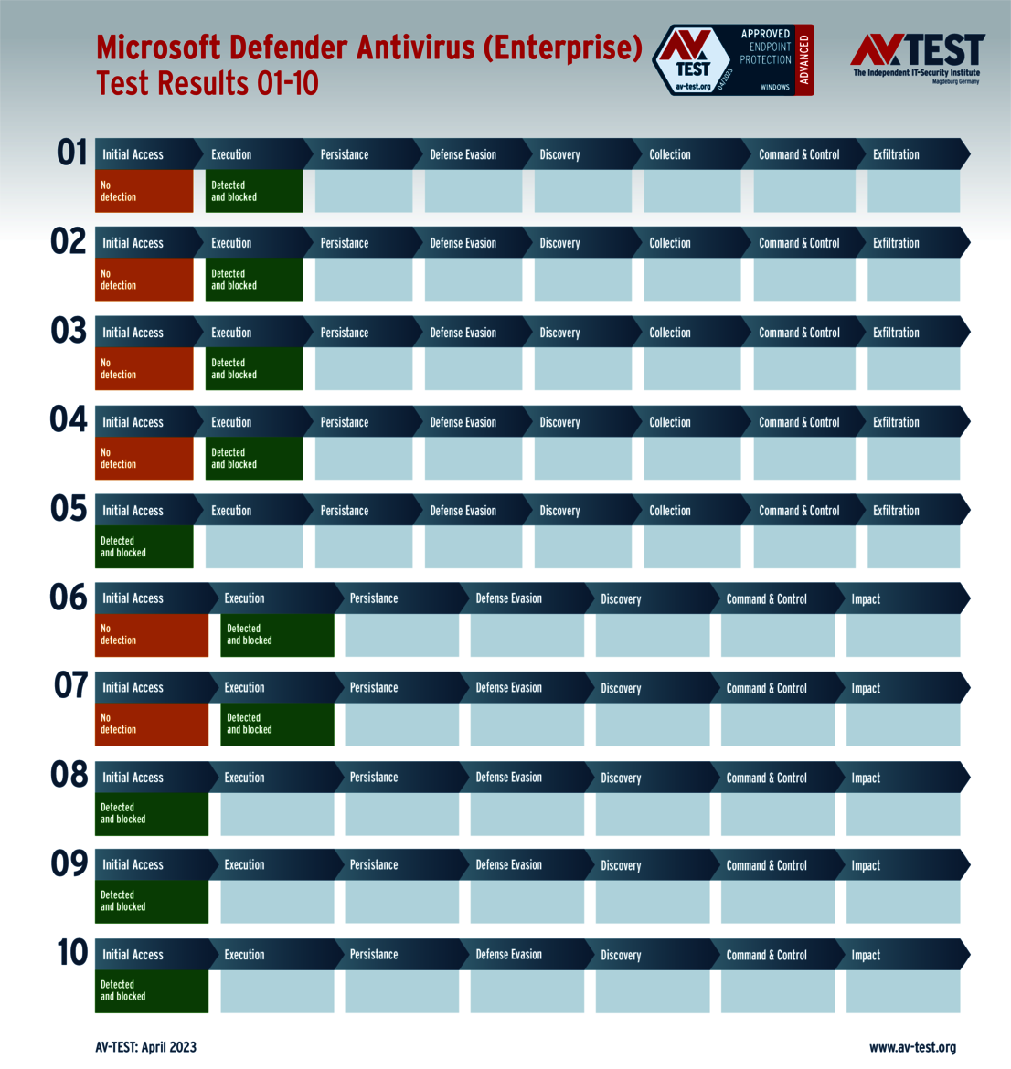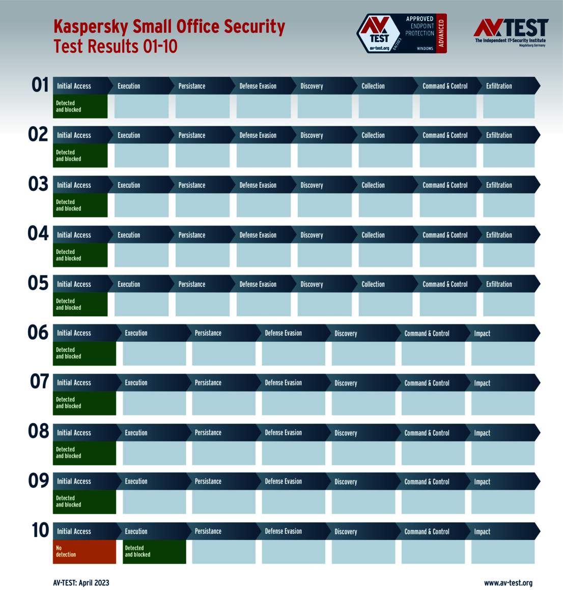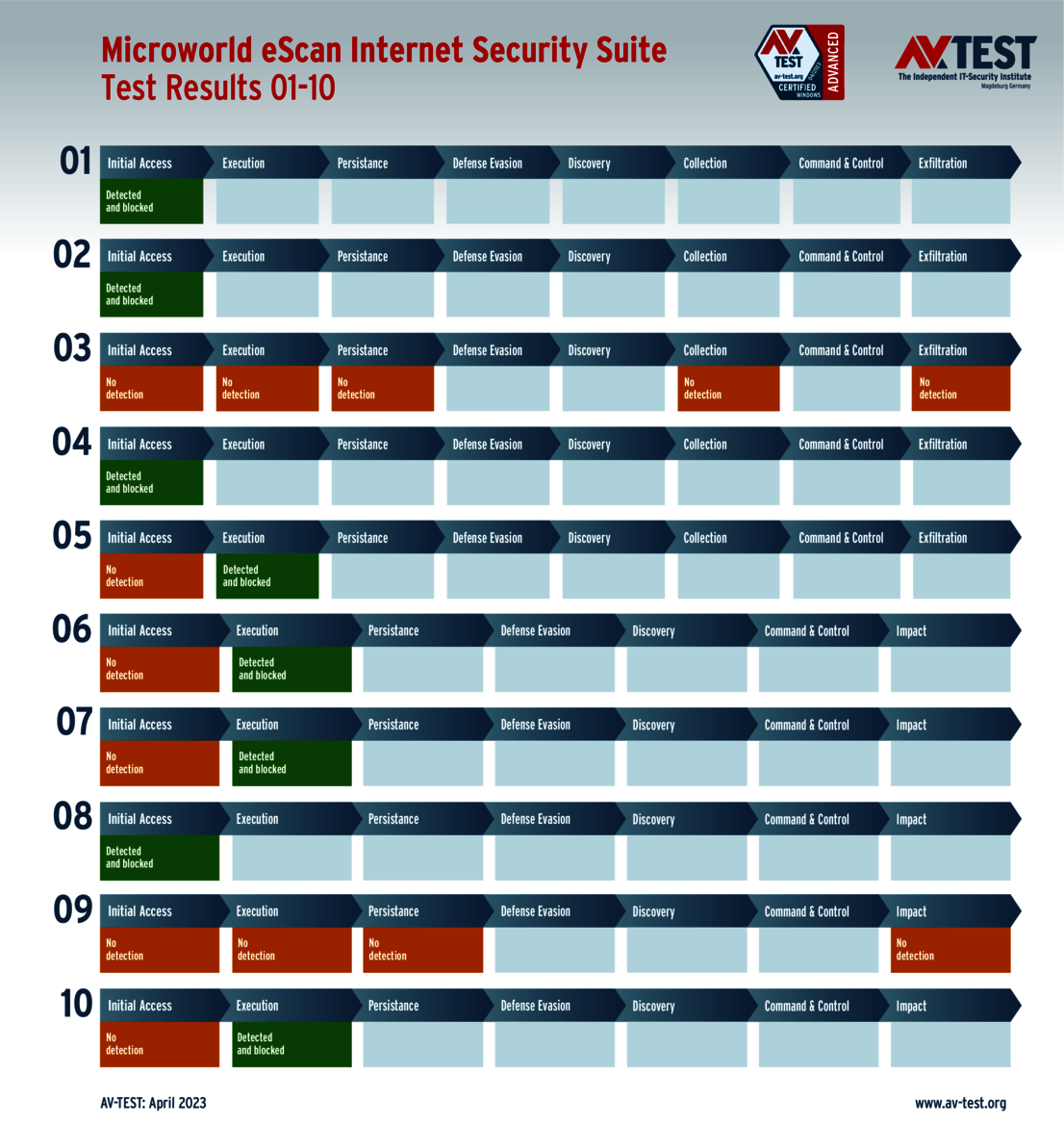 In this test, the lab sent 5 samples of data stealers and 5 samples of ransomware via spearphishing e-mail to the test systems. Afterwards, they first ended up on the system and became active in the next step. Already in these two steps, many products detected the danger and fended off the attack. If that is not the case, the data stealers are able to gather information on the data that they "exfiltrate" to a C2 server. The ransomware also collects information, but with the intention of sending out a file list to the C2 server while the encryption of data is being launched. The 10 scenario graphics show the attack routines. Cases 1 through 5 describe the attack of data stealers and cases 6 through 10 the attacks of ransomware.