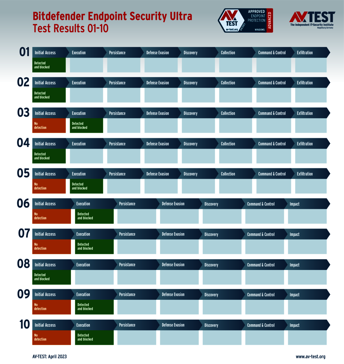 While Bitdefender Endpoint Security detected the attackers in all 10 test scenarios, it was unable to completely stop the attackers in 2 cases involving ransomware. It did execute several countermeasures, but in the end a partial encryption of individual files occurred in both cases. This led to a deduction of points. The result was 33 out of 35 possible points for the protection score.