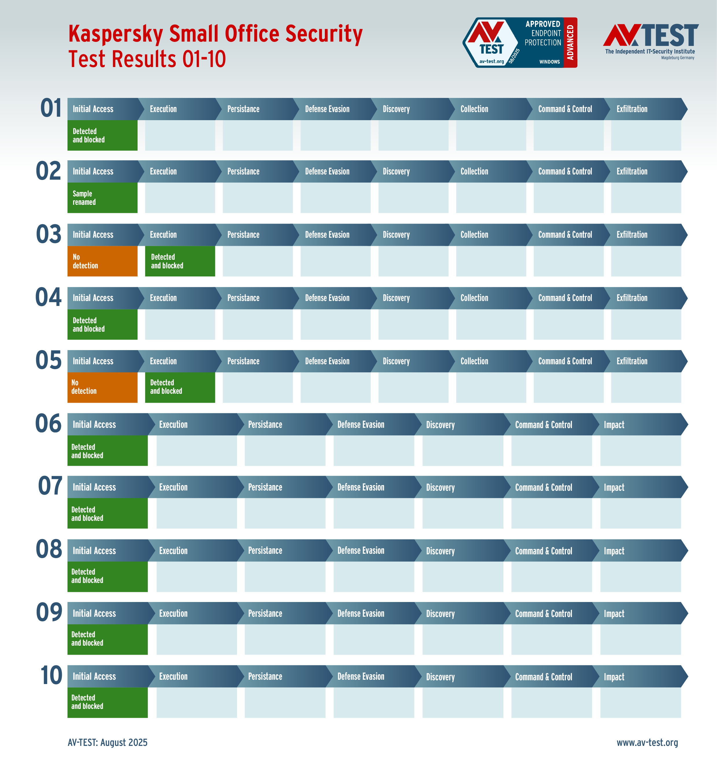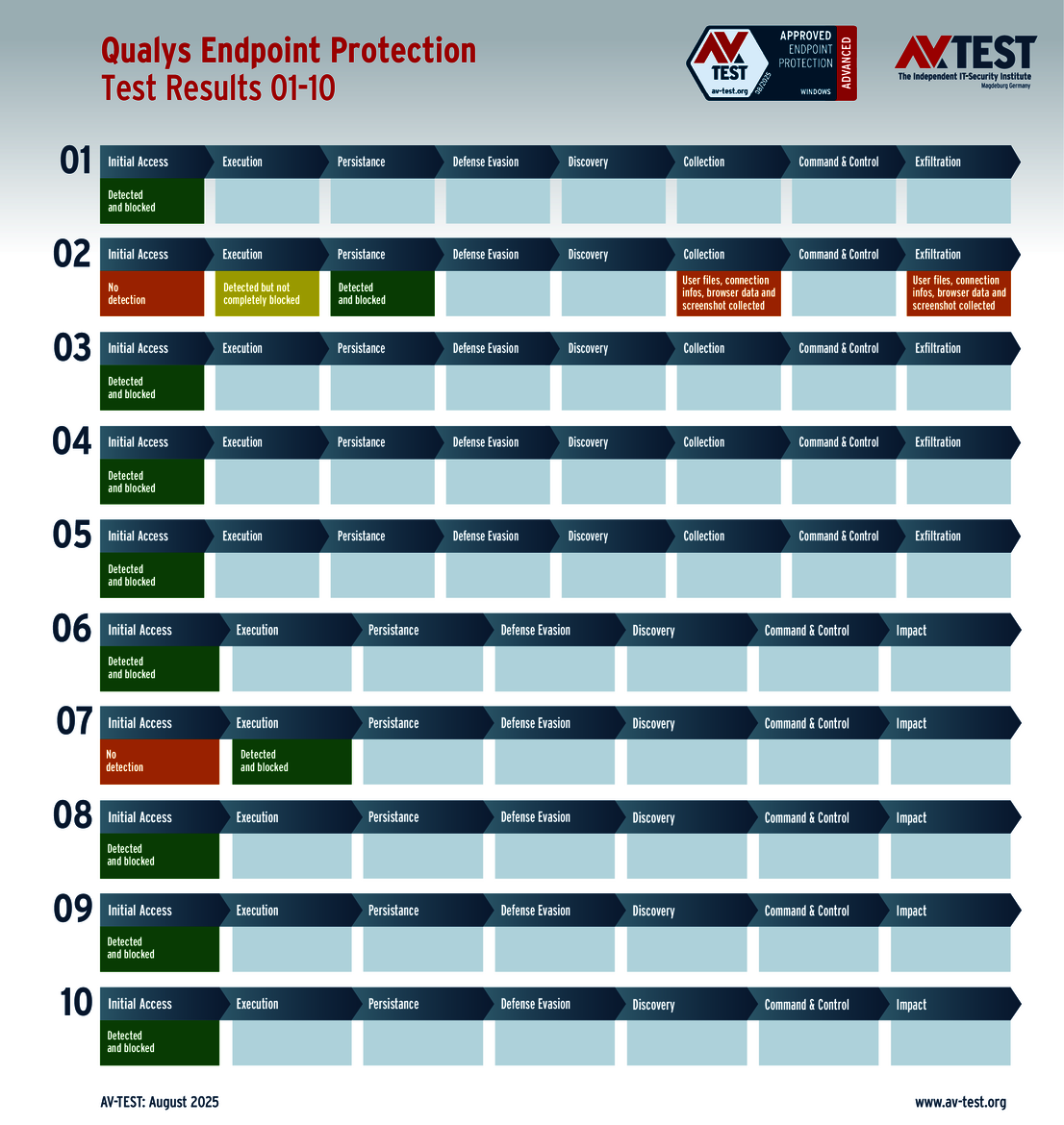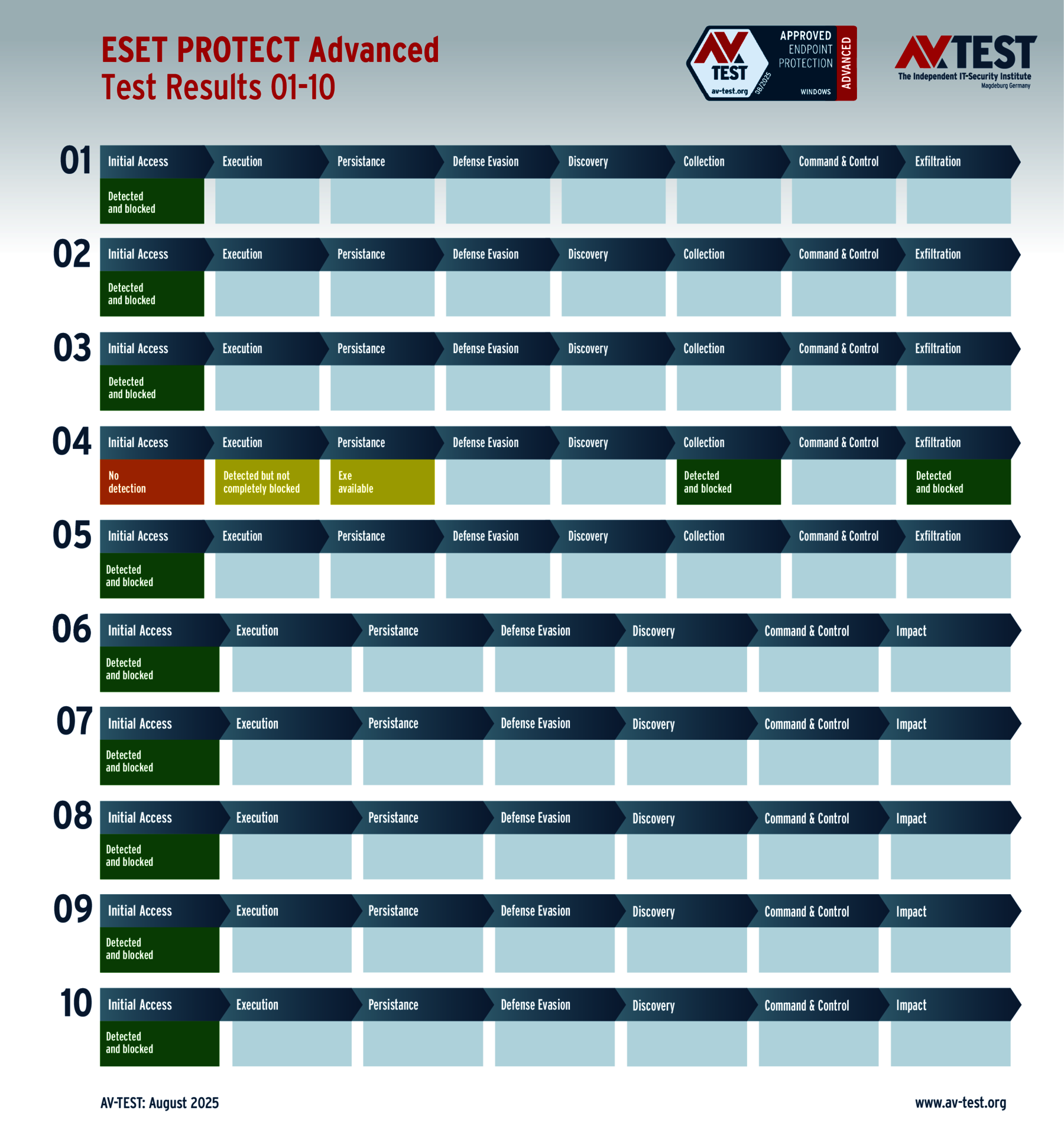 There were only a few minor issues with the solutions from ESET and Qualys. For example, ESET detected all 10 attackers, but it could not completely block one infostealer. The malware was able to proceed with its attack, but it was then blocked and subsequently dealt with by the downstream protective mechanisms. Nevertheless, this cost ESET a one-point deduction, leading to a final score of 34 out of 35 points.