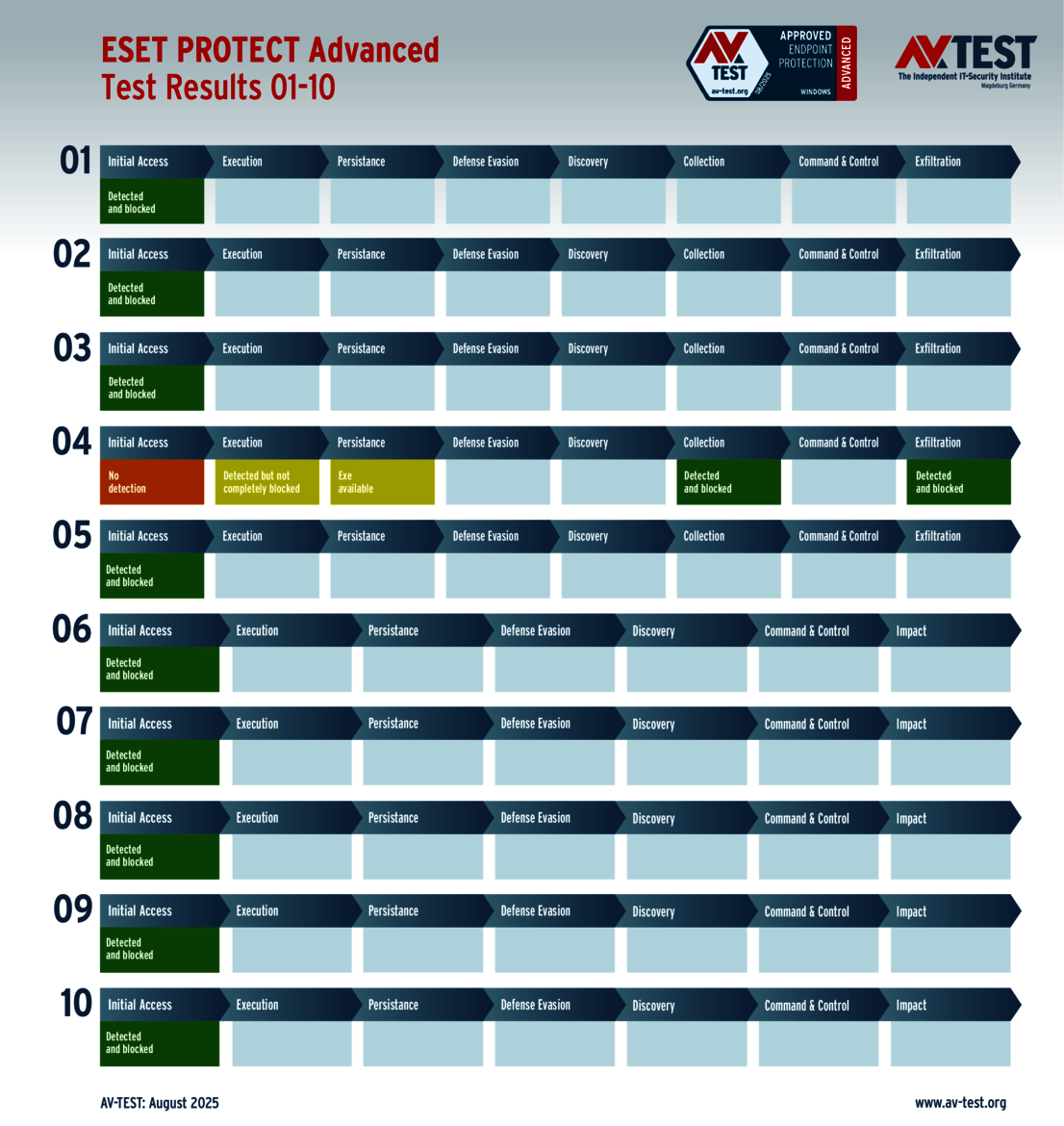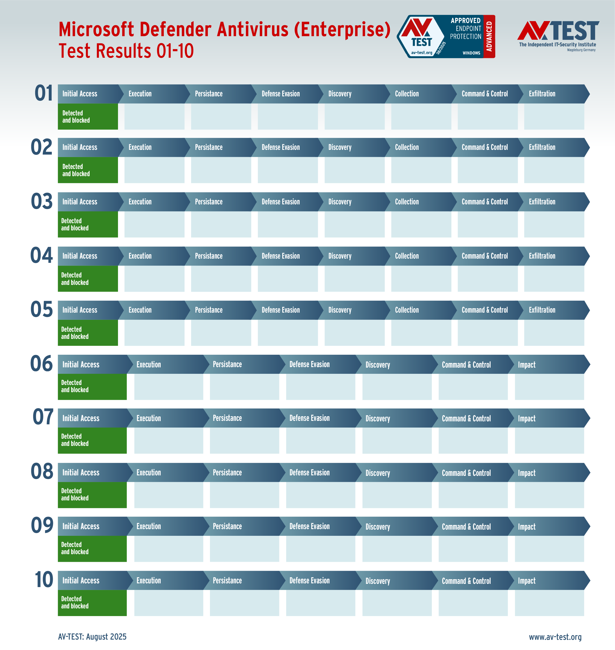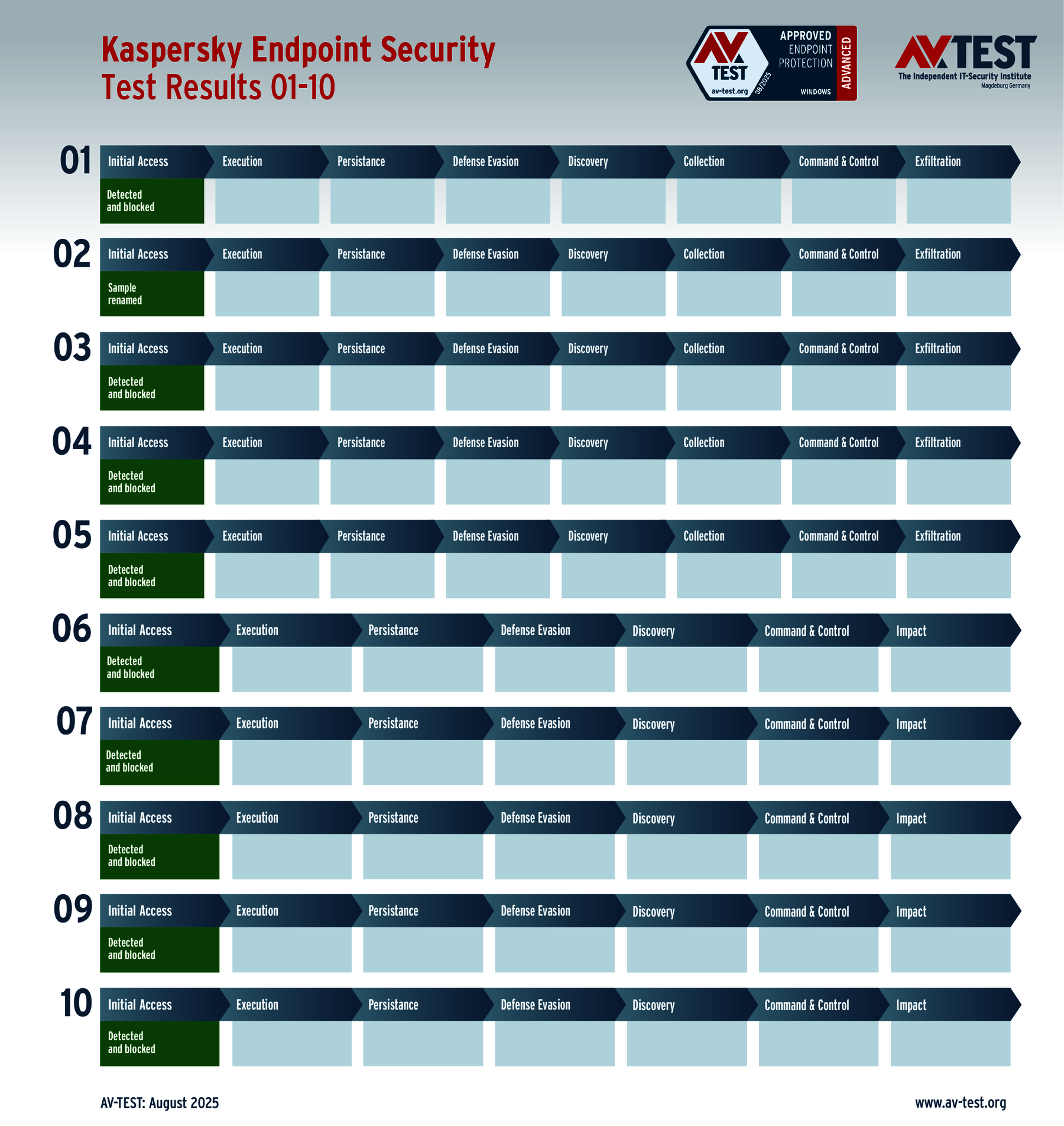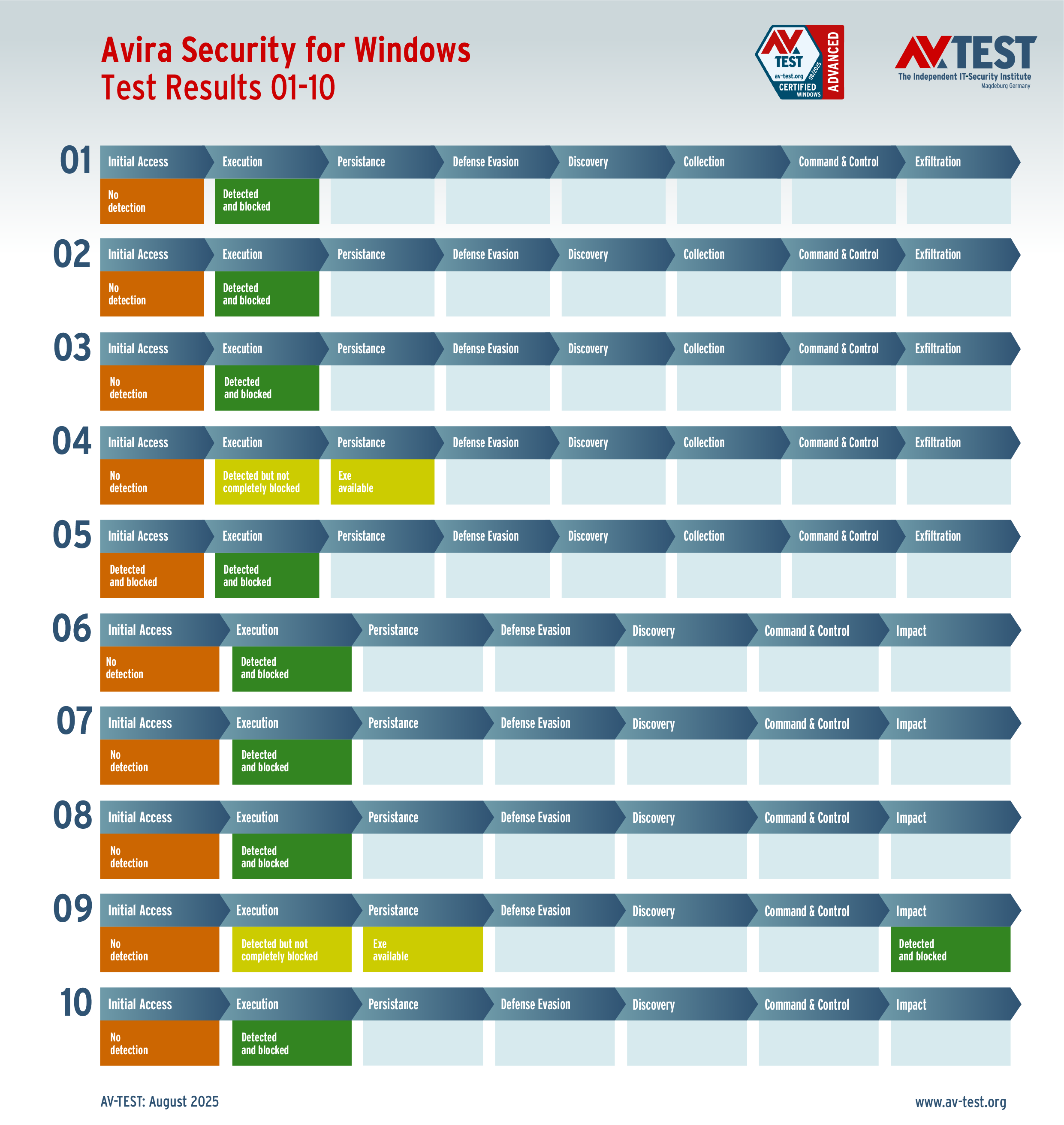 The techniques used for the attacks by these groups of malware are sophisticated, but they are not insurmountable. This is also evidenced by the vast AV-ATLAS database from AV-TEST, which has already detected and registered nearly one billion samples of malware for Windows systems. Nonetheless, attackers are always uncovering new vulnerabilities, using devious attack variants, or combining both to exploit unwitting systems. Which means that good security software also needs to identify these new techniques and provide protection to the systems. Sometimes, it’s not enough to just identify the malware. Some attackers use obfuscation to conceal themselves in seemingly harmless processes, enabling them to evade detection in a scan for malware. Does that mean it’s time to throw in the towel? This was precisely the question resolved by the Advanced Threat Protection (ATP) test. The testers followed 10 attacks with ransomware and infostealers step by step in this live test of systems running Windows 10. The malware in the testing employed the latest in attack technology to evade detection. And when they attempt this feat, the downstream defense mechanisms need to intervene and stop the attack. The ATP test clearly shows how well the different solutions performed in the various stages.