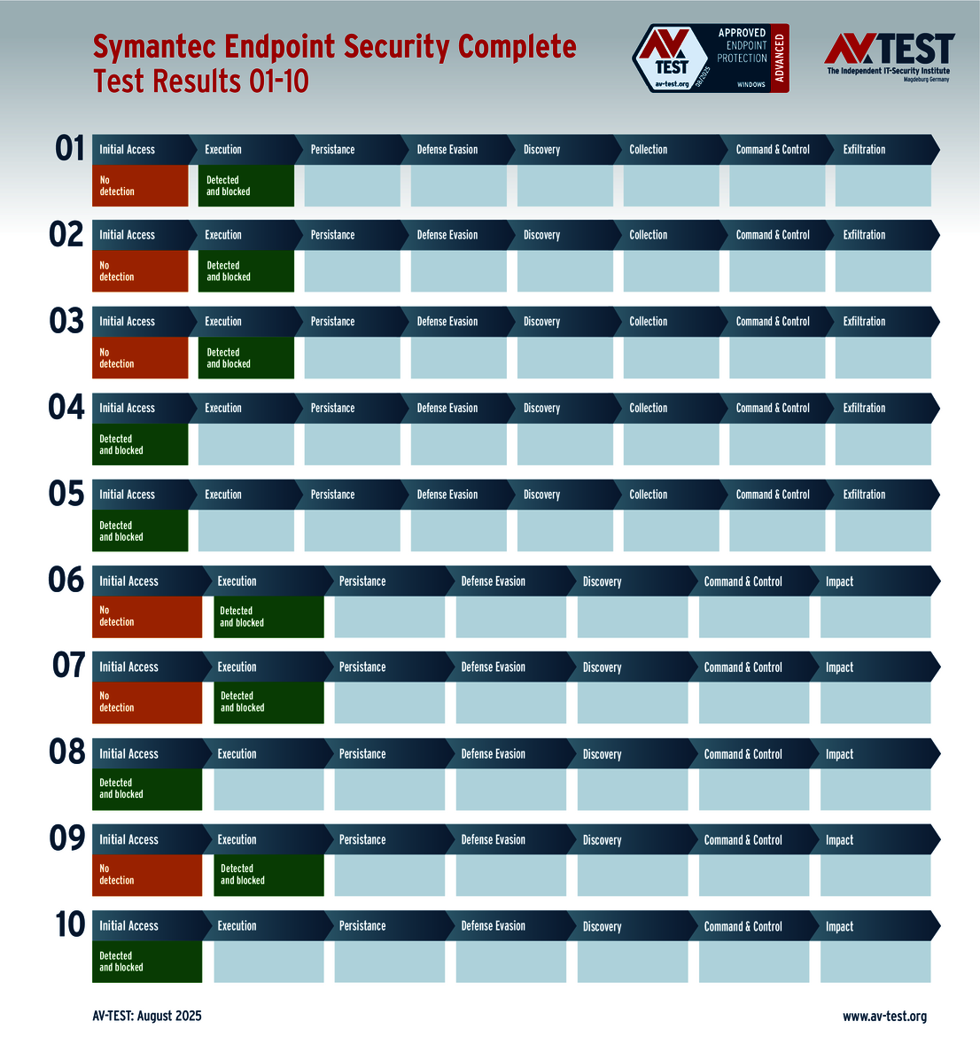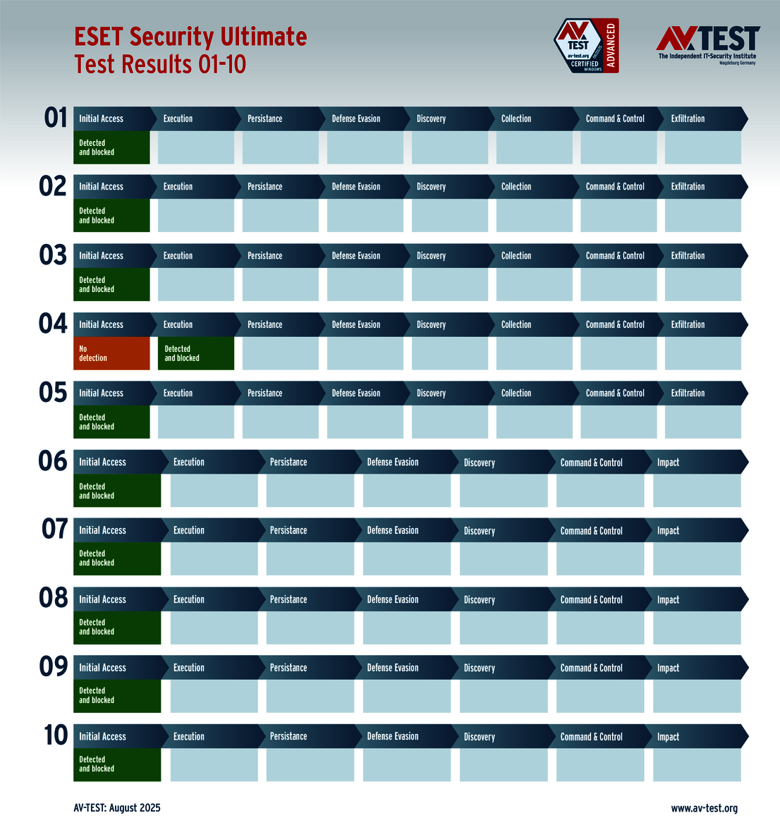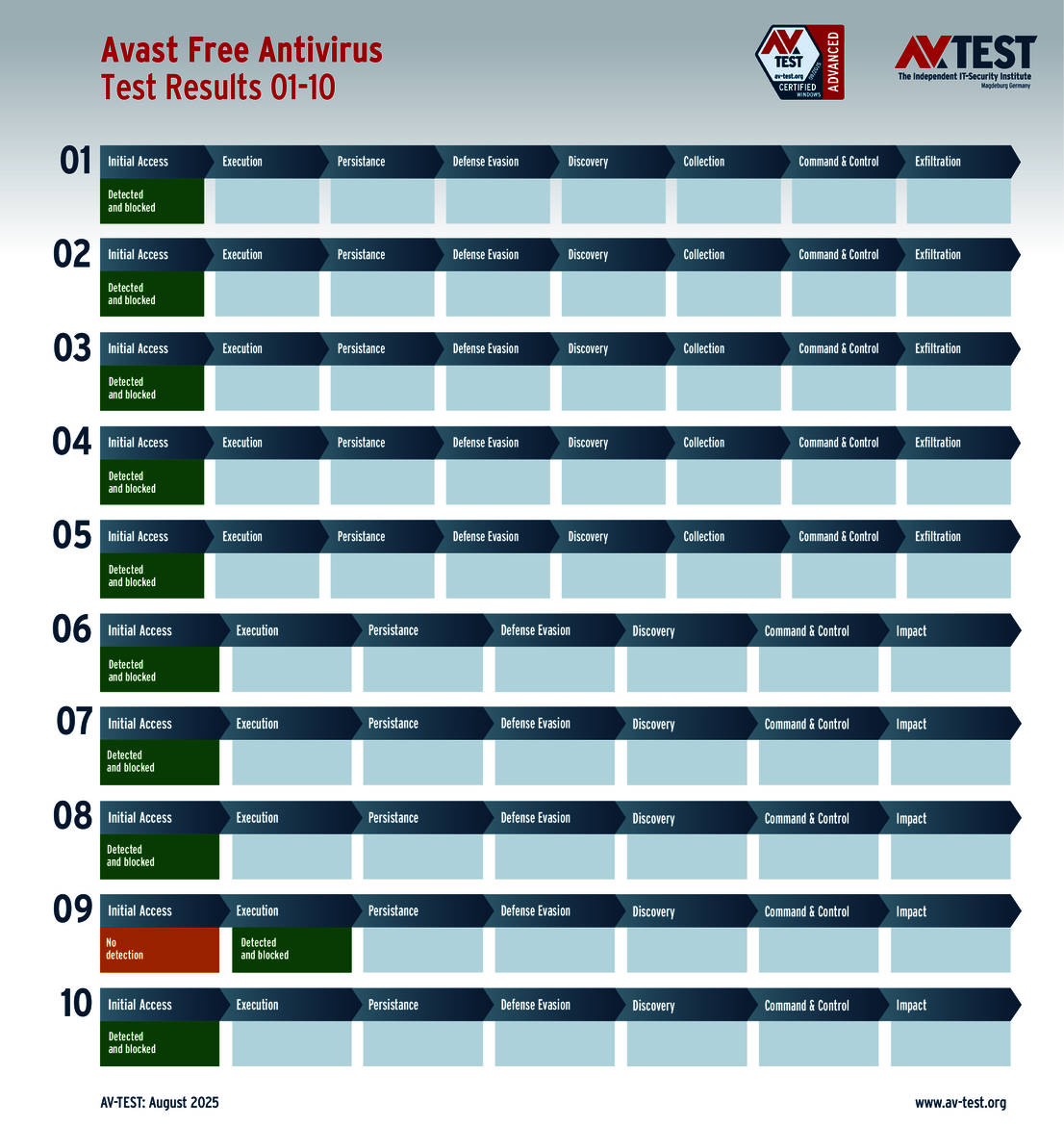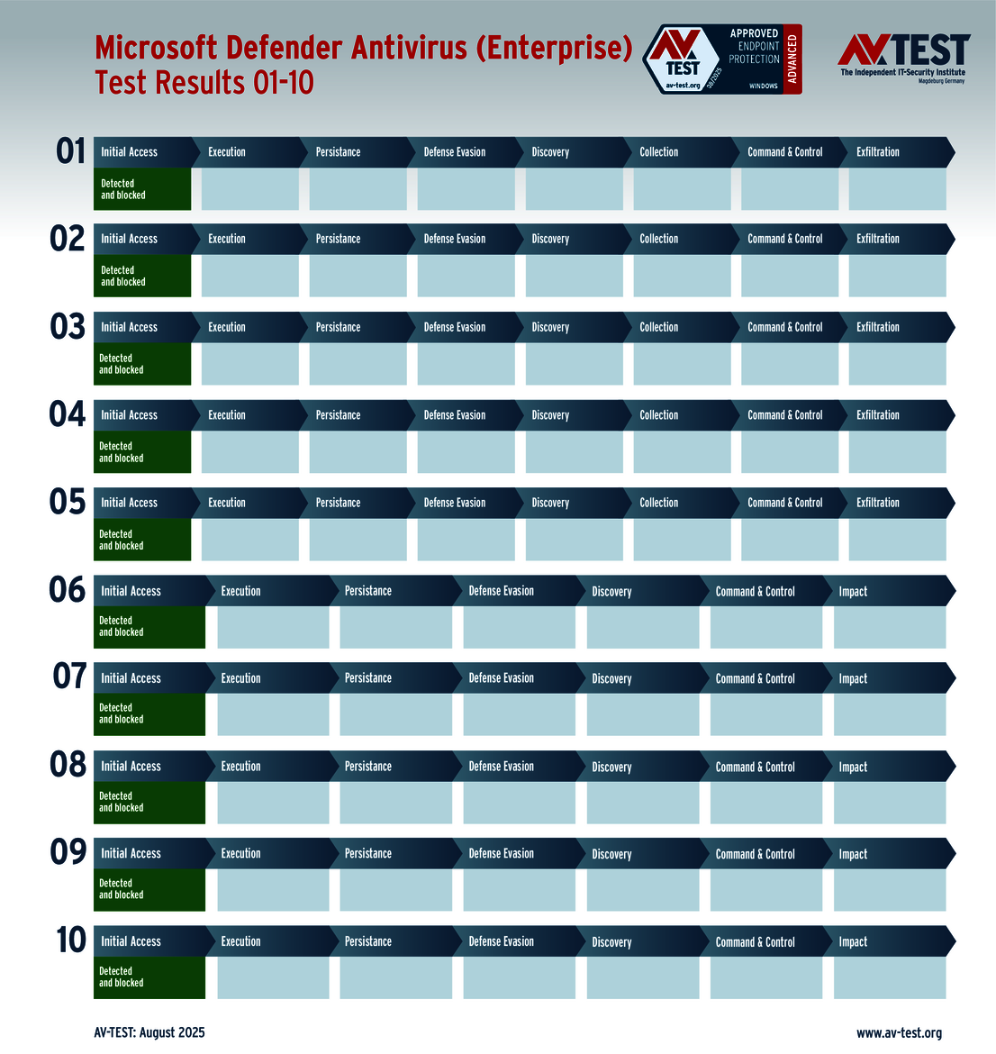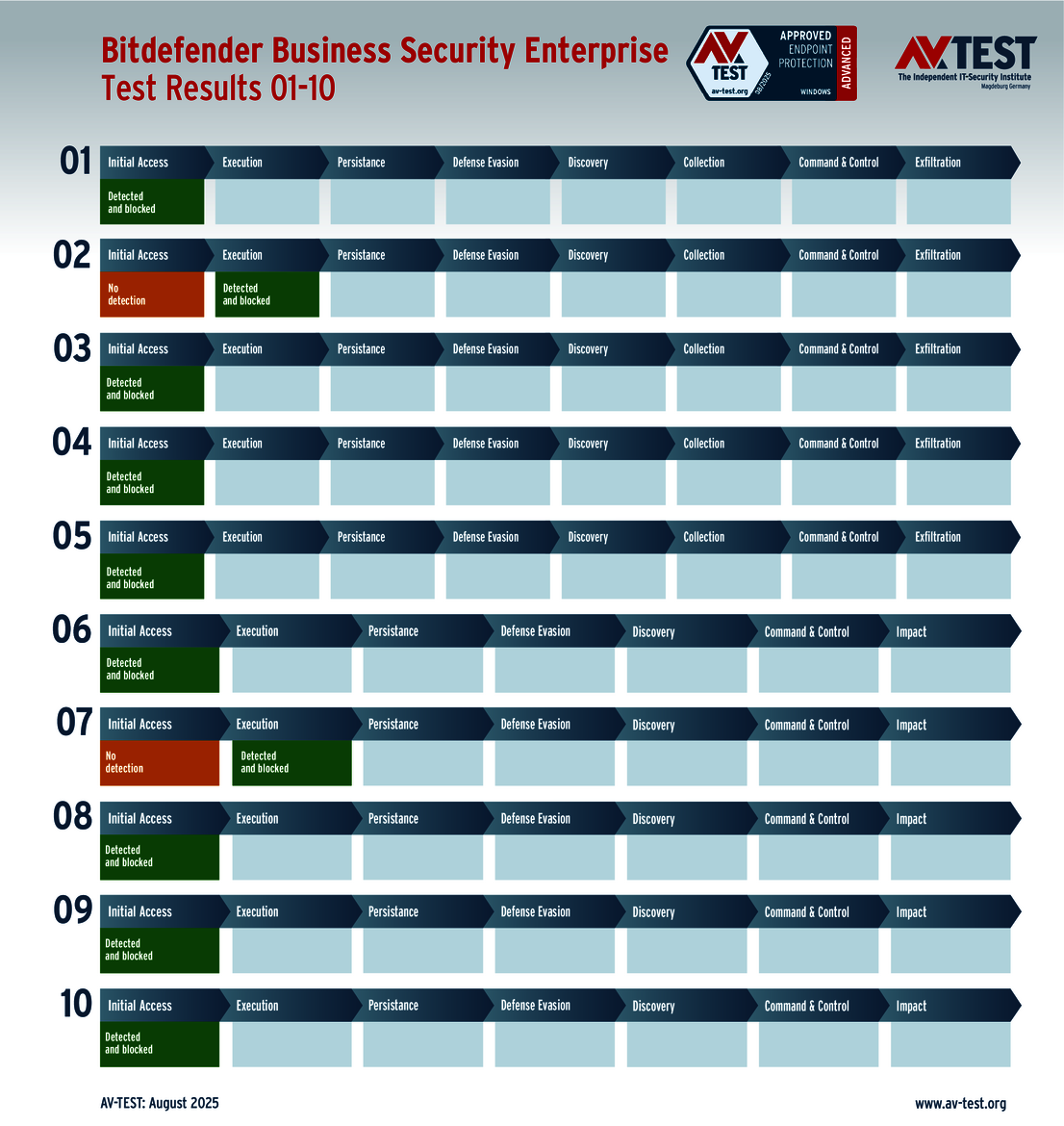 The techniques used for the attacks by these groups of malware are sophisticated, but they are not insurmountable. This is also evidenced by the vast AV-ATLAS database from AV-TEST, which has already detected and registered nearly one billion samples of malware for Windows systems. Nonetheless, attackers are always uncovering new vulnerabilities, using devious attack variants, or combining both to exploit unwitting systems. Which means that good security software also needs to identify these new techniques and provide protection to the systems. Sometimes, it’s not enough to just identify the malware. Some attackers use obfuscation to conceal themselves in seemingly harmless processes, enabling them to evade detection in a scan for malware. Does that mean it’s time to throw in the towel? This was precisely the question resolved by the Advanced Threat Protection (ATP) test. The testers followed 10 attacks with ransomware and infostealers step by step in this live test of systems running Windows 10. The malware in the testing employed the latest in attack technology to evade detection. And when they attempt this feat, the downstream defense mechanisms need to intervene and stop the attack. The ATP test clearly shows how well the different solutions performed in the various stages.