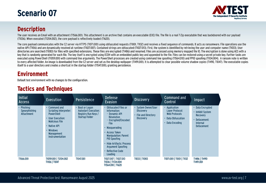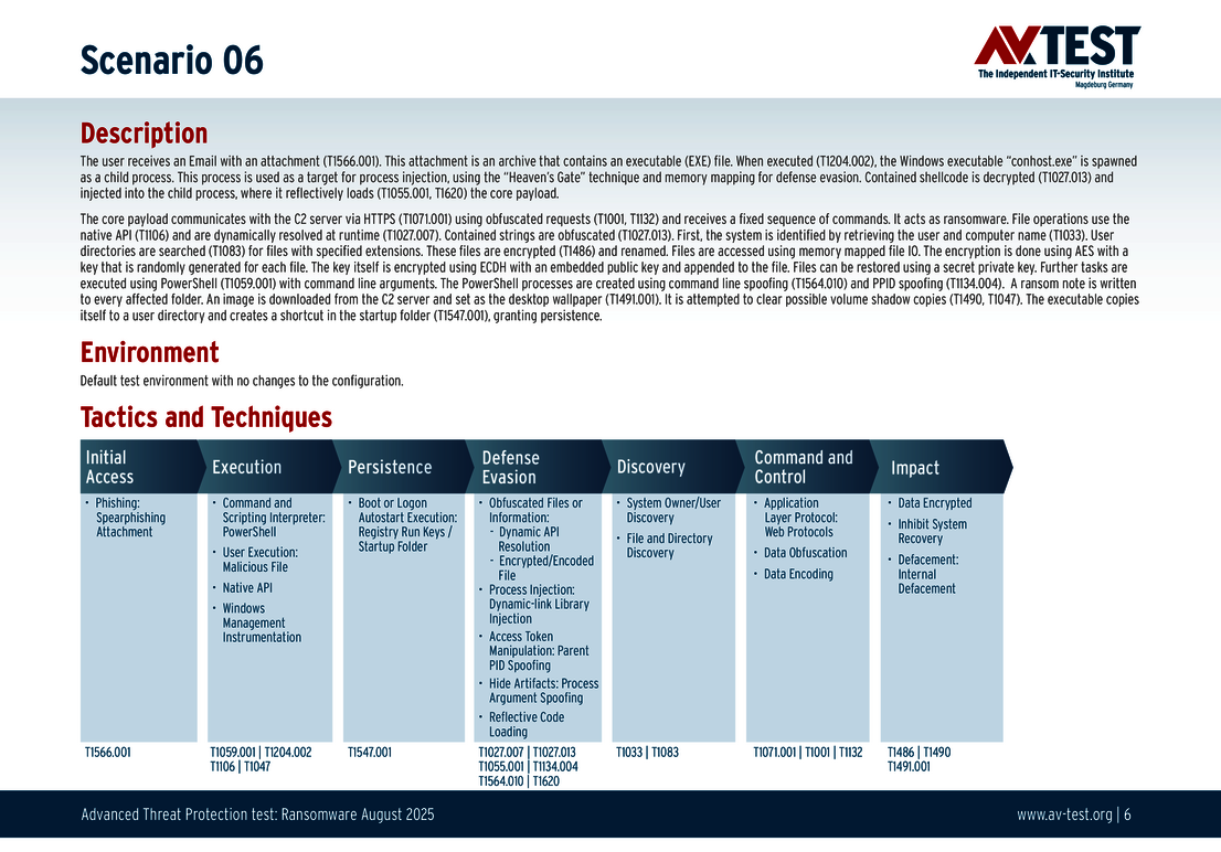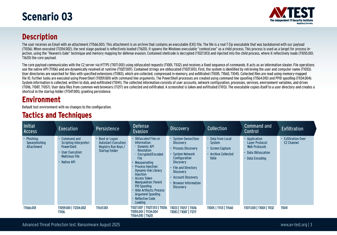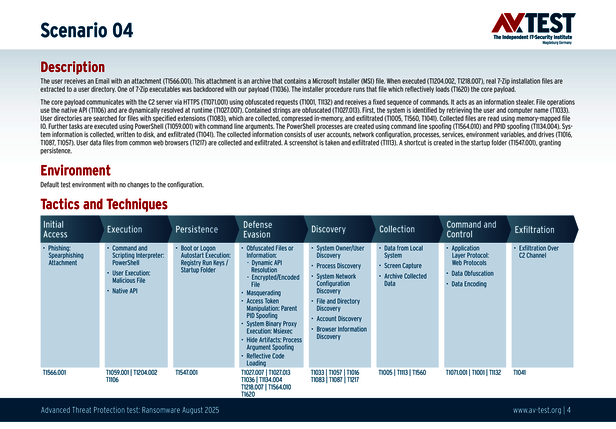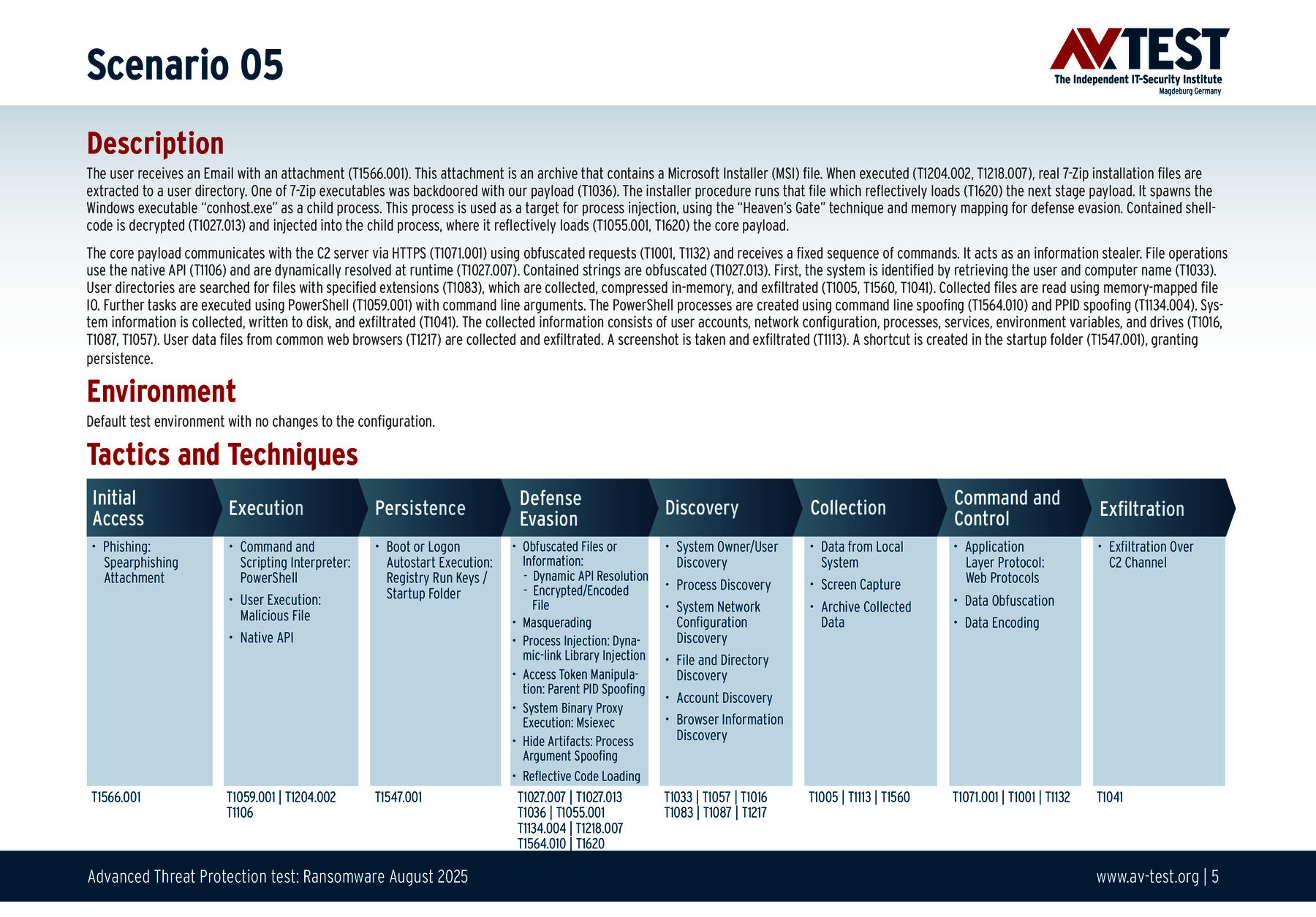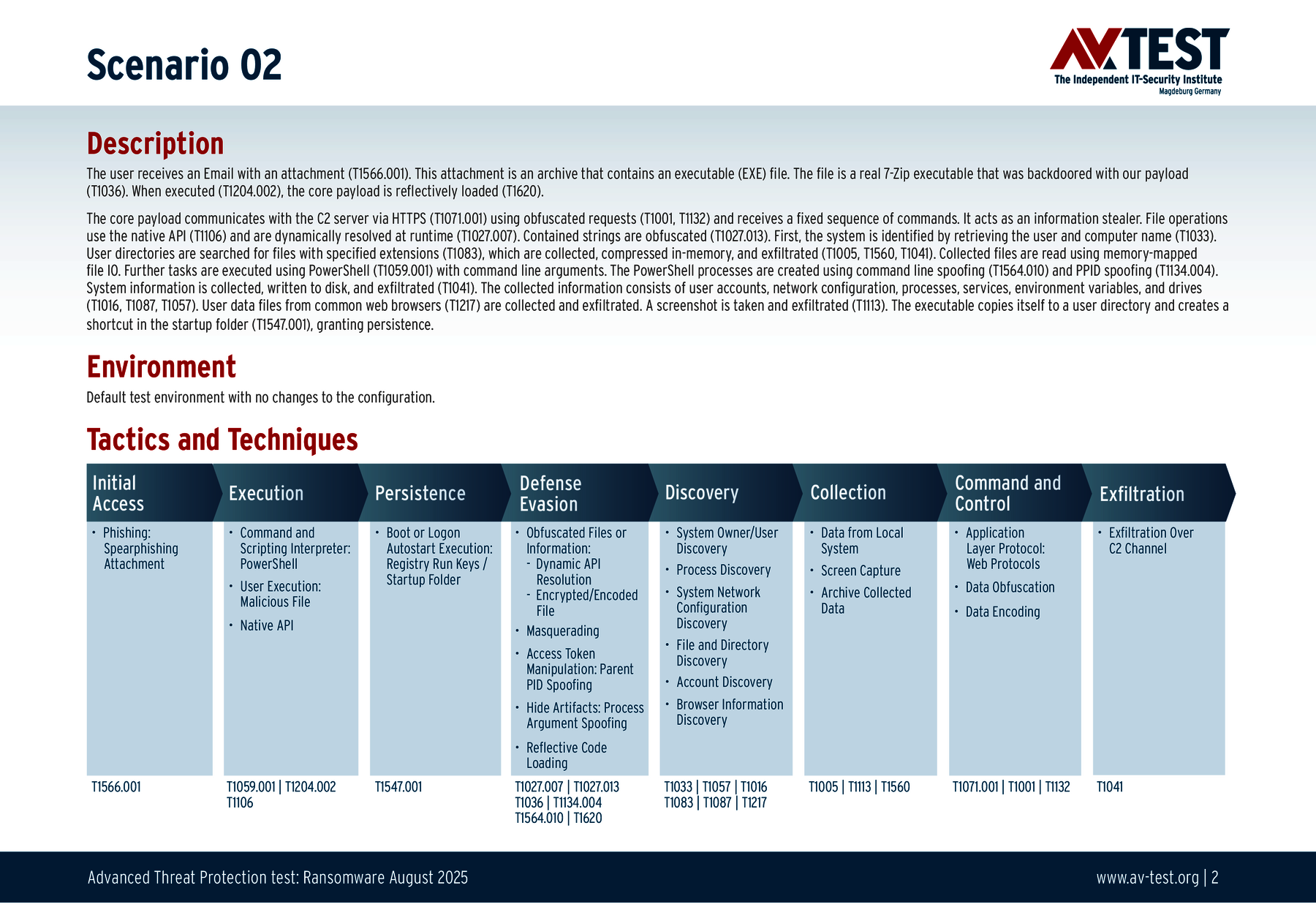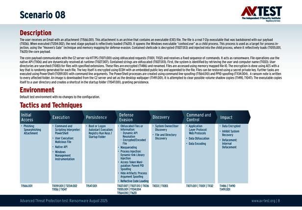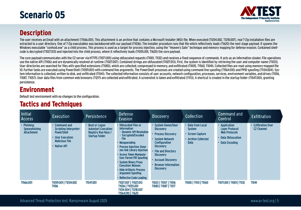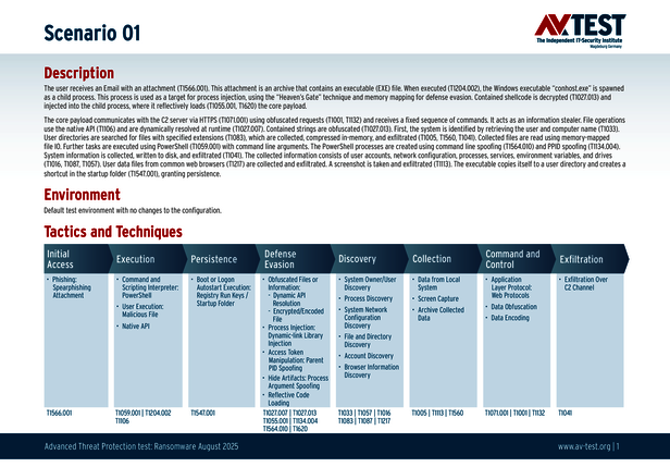 All attack scenarios are documented according to the standard of the MITRE ATT&CK database. The individual sub-techniques are listed in the MITRE database for "Techniques", for example "T1566.001" under "Phishing: Spearphishing Attachment”. Each test step is thus defined among the experts and can be logically understood. In addition, all attack techniques are explained, along with how the malware infection occurs and impacts systems.