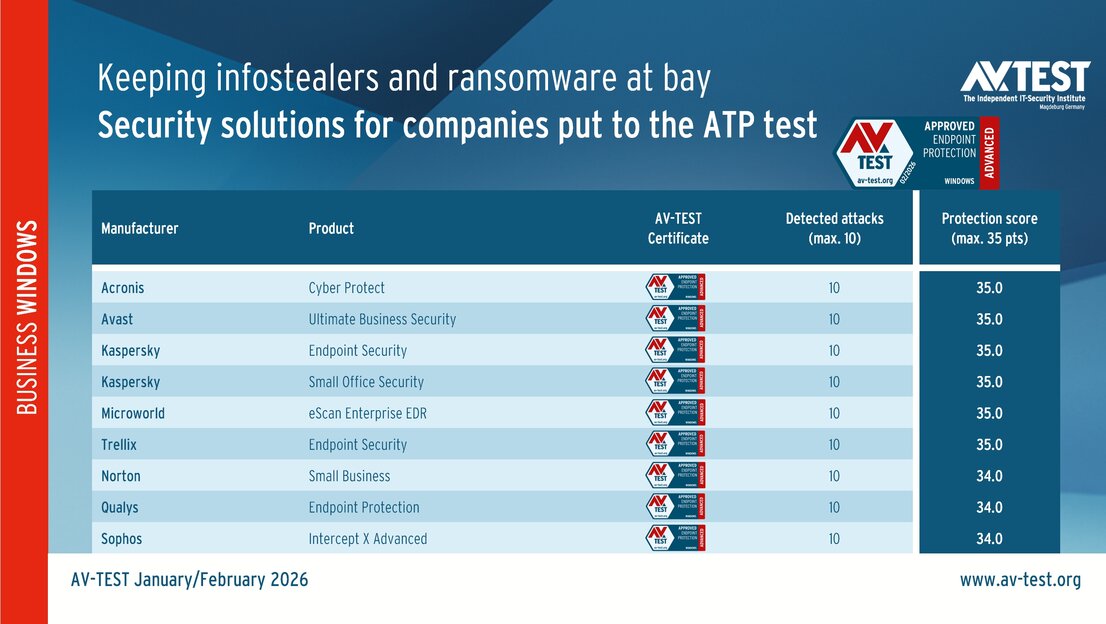 There were 9 solutions tested for use in the corporate environment. 6 of the 9 products scored full points in the ATP test. In all 10 scenarios, they identified the attackers without fail and earned 35 points each in the protection category: Acronis, Avast, Kaspersky (with two versions), Microworld and Trellix.